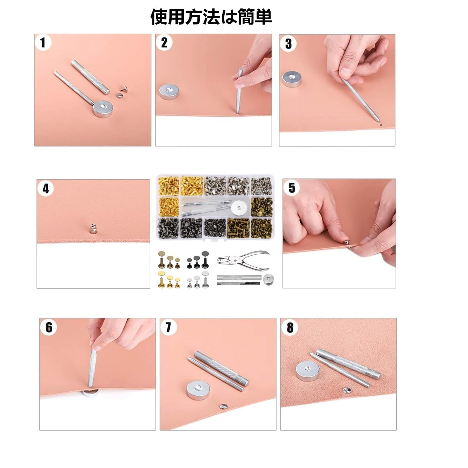【パッケージ内容】カシメセット *360組、パンチペンチ*1、 打ち棒*2、 打ち台*1、 収納ケース*1 。4色:ゴールド、シルバー、古銅色、ガンメタル。3サイ ズ :(6*6mm/8*8mm/8*12mm)各30組。豊富なアクセサリーがありますから、いろいろな綺麗なレザー工芸品ができます。