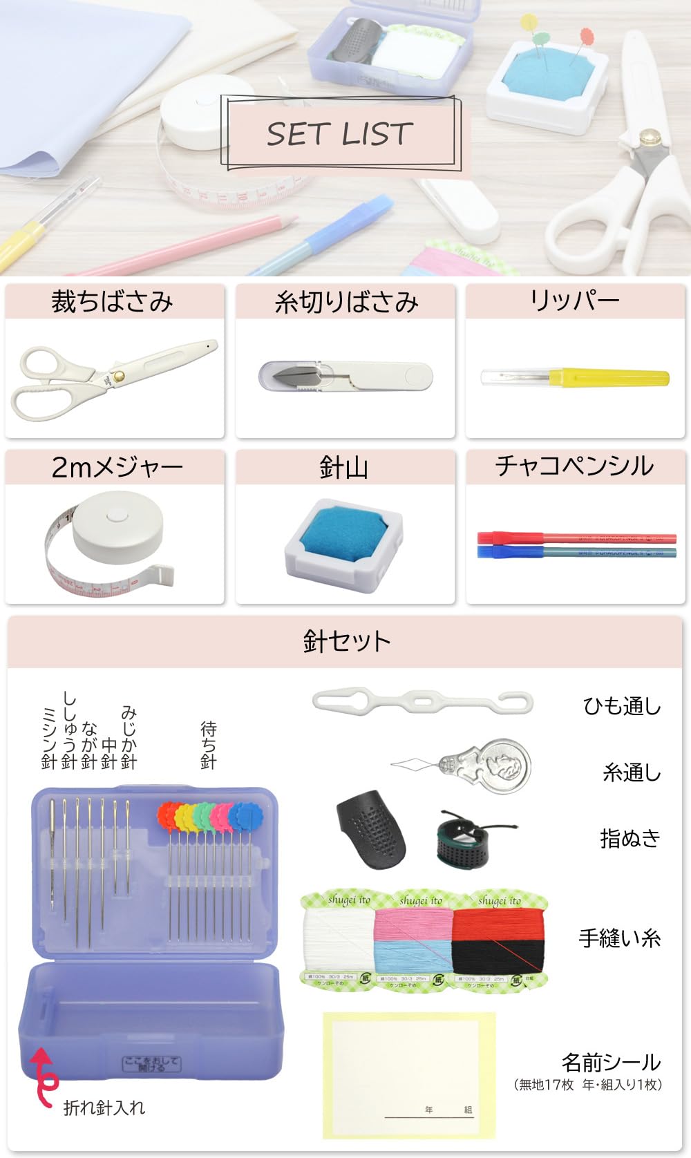 【セット内容】・裁縫バッグ ・針セット(折れ針入れ付き) なが針×2、中針×1、ししゅう針×1、みじか針×2、ミシン針×1、マチ針×10 名前シール×1、指ぬき2種、糸通し×1、ひも通し×1 手縫い糸(白25m、赤・黒・ピンク・ブルー各約12.5m) ・針山 ・リッパー ・2m巻きメジャー ・日本製21cm裁ちばさみ(右利き、左利きは商品名をご確認ください) ・糸切りばさみ ・チャコペンシルピンク・ブルー ※はさみの刃の表面についている油は錆止め用です。ティッシュ等で軽く拭き取ってからご使用ください。