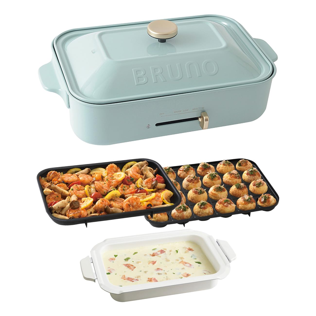 BRUNO ブルーノ コンパクトホットプレート 本体 プレート3種 (たこ焼き セラミックコート鍋 平面) ブルーグレー 青 灰 Blue Gray おしゃれ かわいい これ1台 一台 蓋 ふた付き 1200w 温度調節 洗いやすい 1人 2人 3人用 小型 ひとり暮らし にも A4 サイズ BOE021-BGY