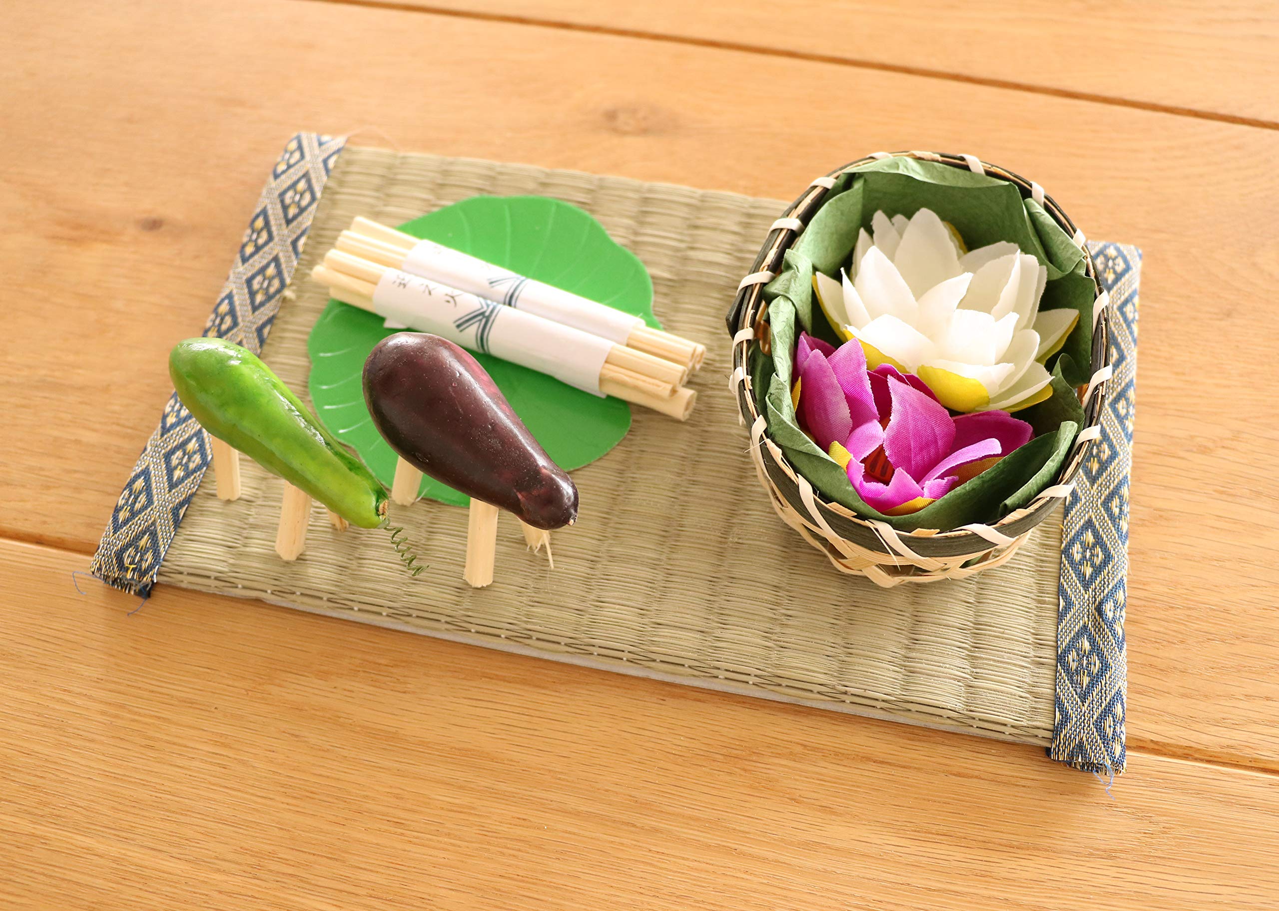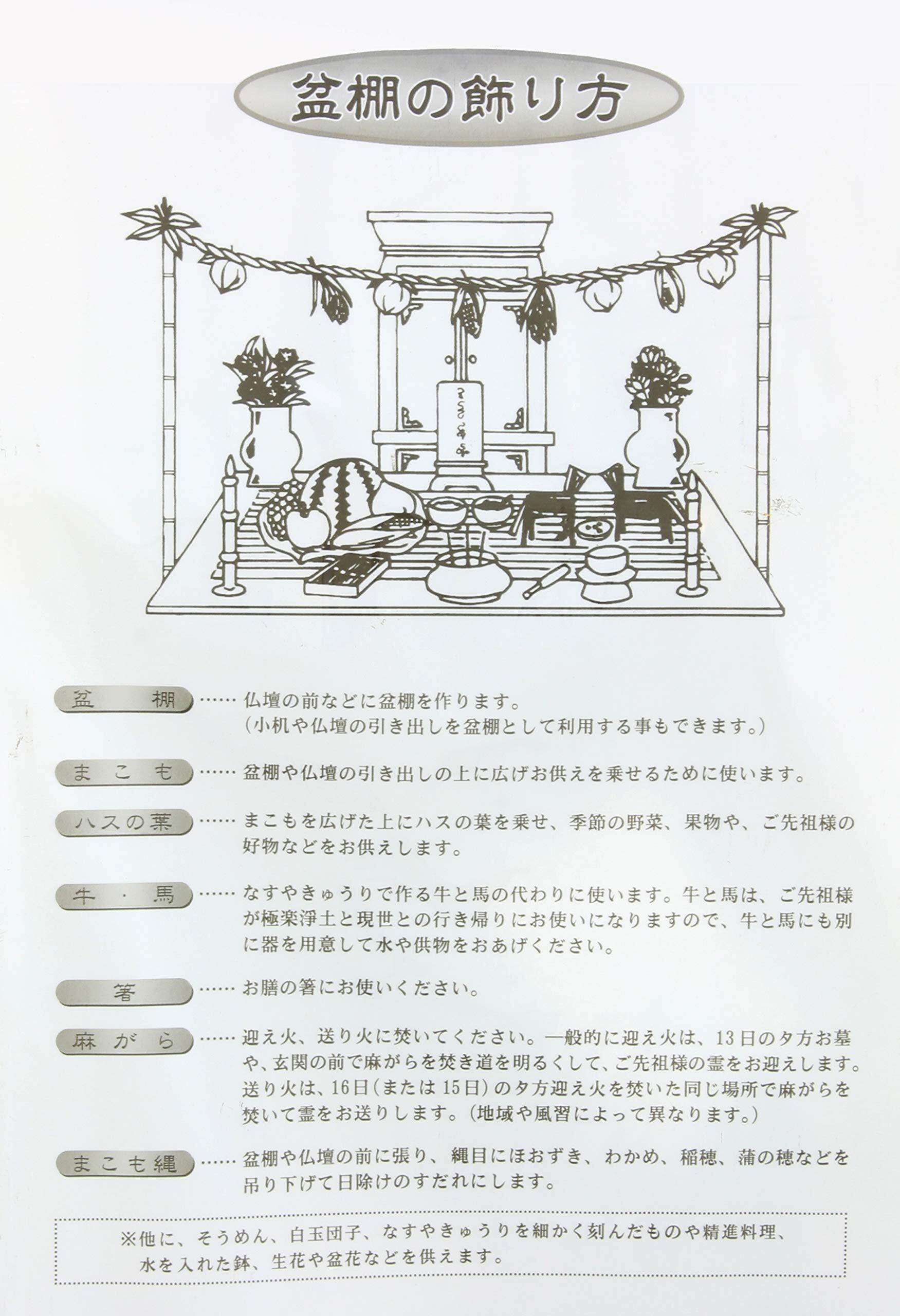 セット内容:台座(いぐさ)、麻ガラ、ハスの葉(紙)、ハスの花(籠付き)、牛馬(なす・きゅうり)