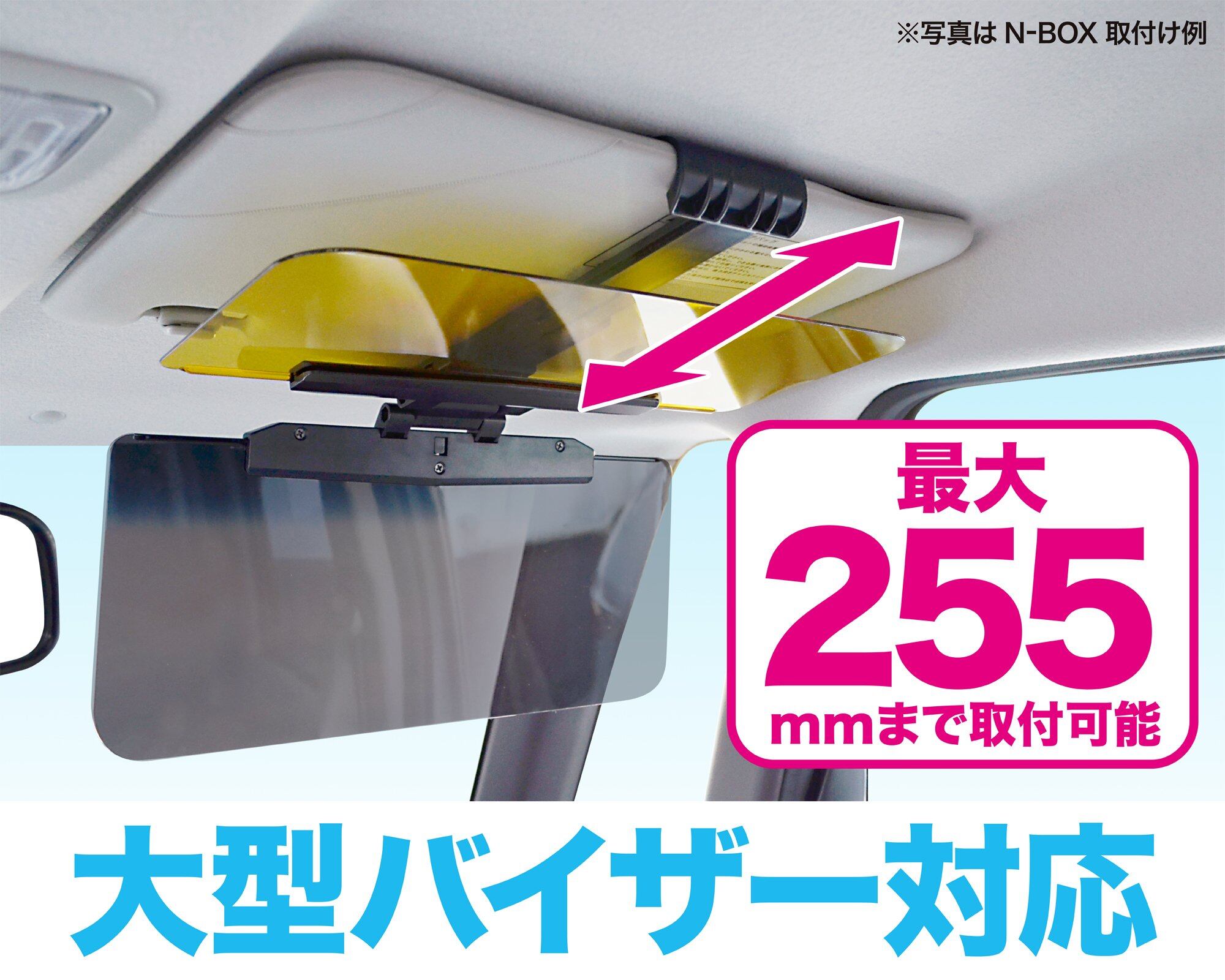 ●サンバイザーの奥行き最大255mmまでに取付け可能です。奥行きが長いサンバイザーを搭載する「天井の高いハイト系軽自動車やミニバン」にもオススメです。