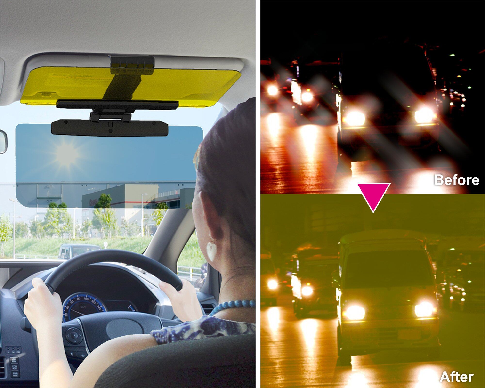 昼は眩しい陽射しをカットし、夜は眩しいライト光をカットします。