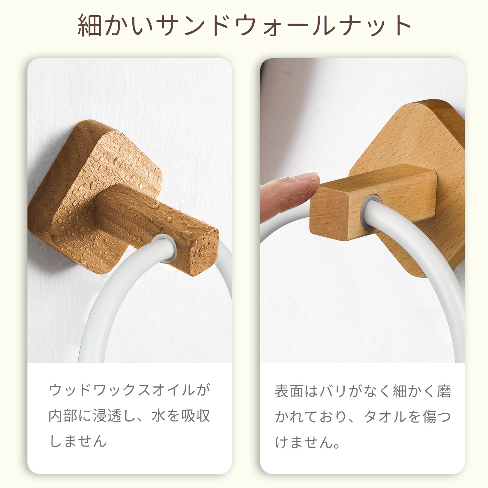 湿気や腐敗を防ぐ: 天然のウッドワックスオイルは?木の台座に障壁を形成し、湿気を防ぎ、細菌の繁殖を抑え、カビの発生を防ぎます。アルミニウム合金表面酸化技術を採用したタオル掛けは、タオルを傷つけず、耐摩耗性や耐食性にも強いです。
