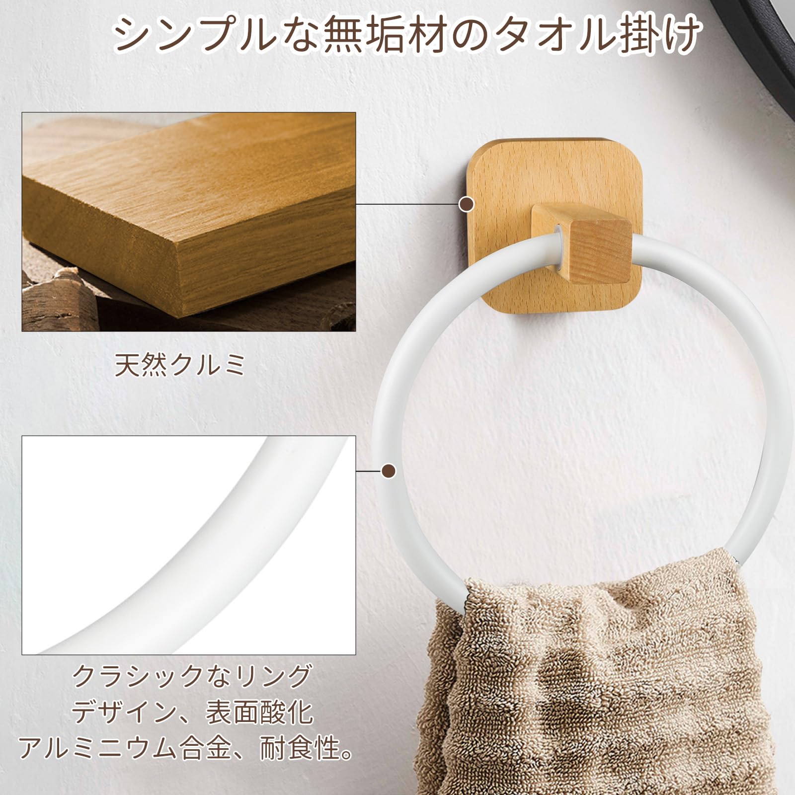 【特価処分】HANNUOXINタオル掛け - リングテールハンガー、壁掛けタオルリング、パンチング設置不要のタオルラック、キッチン、洗面所、バスルームに最適 - ?木製ベース