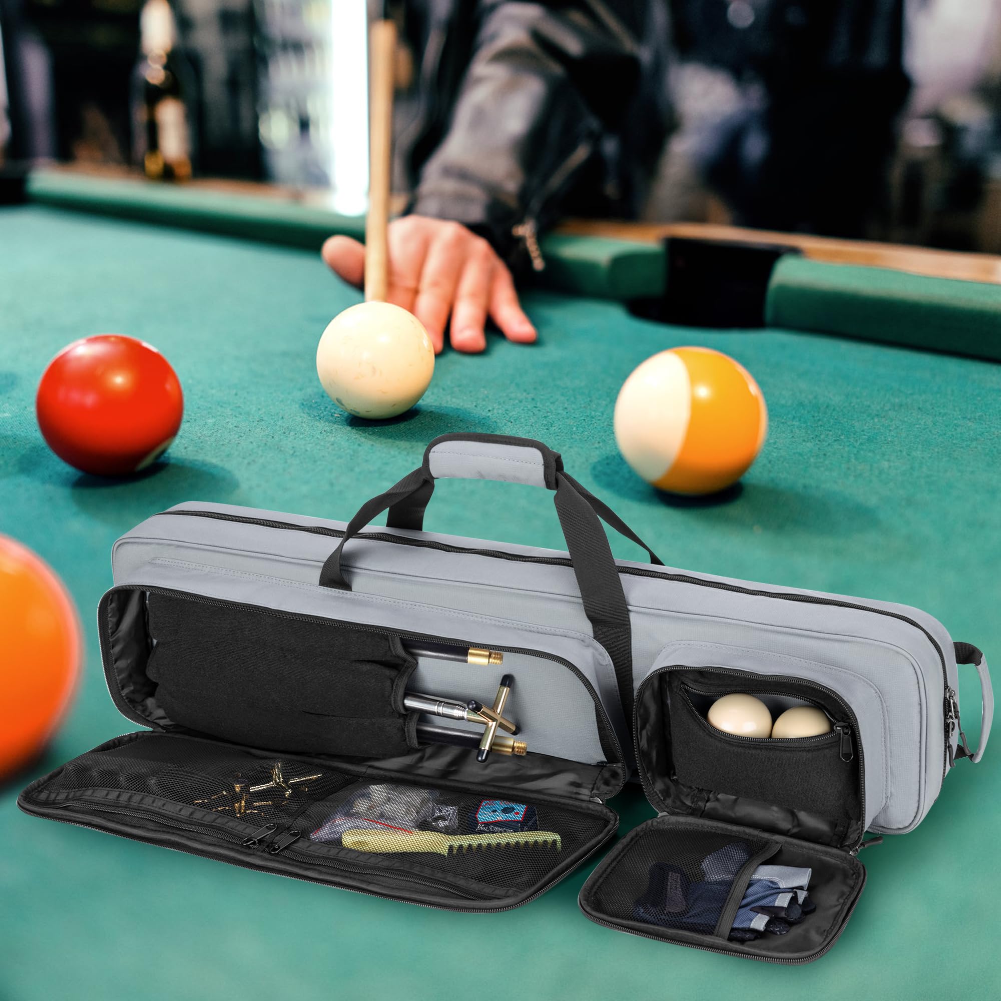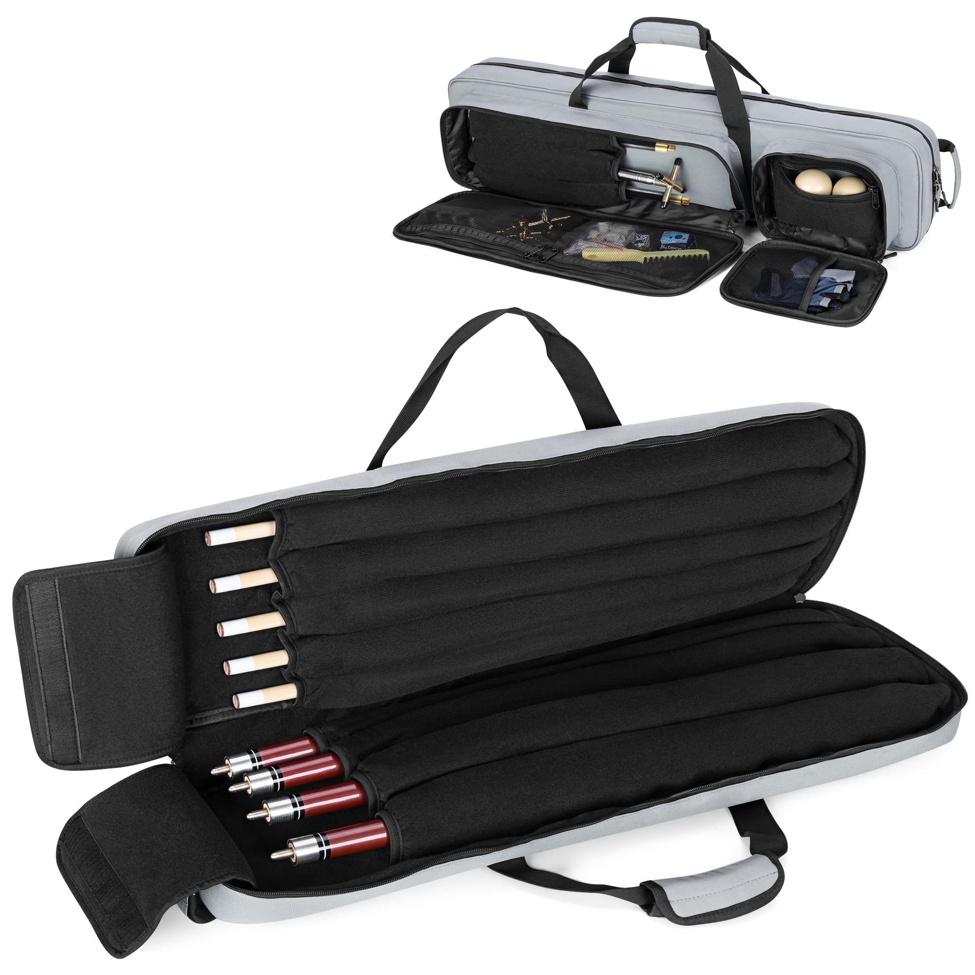 【収納力抜群】プールキューケースには、フラップ開閉式の完全にパッド入りの保護バッグが個別に付属しており、バット4本とシャフト5本を収納できます。柔らかいパッド入りの裏地がプールキューを損傷から保護します。