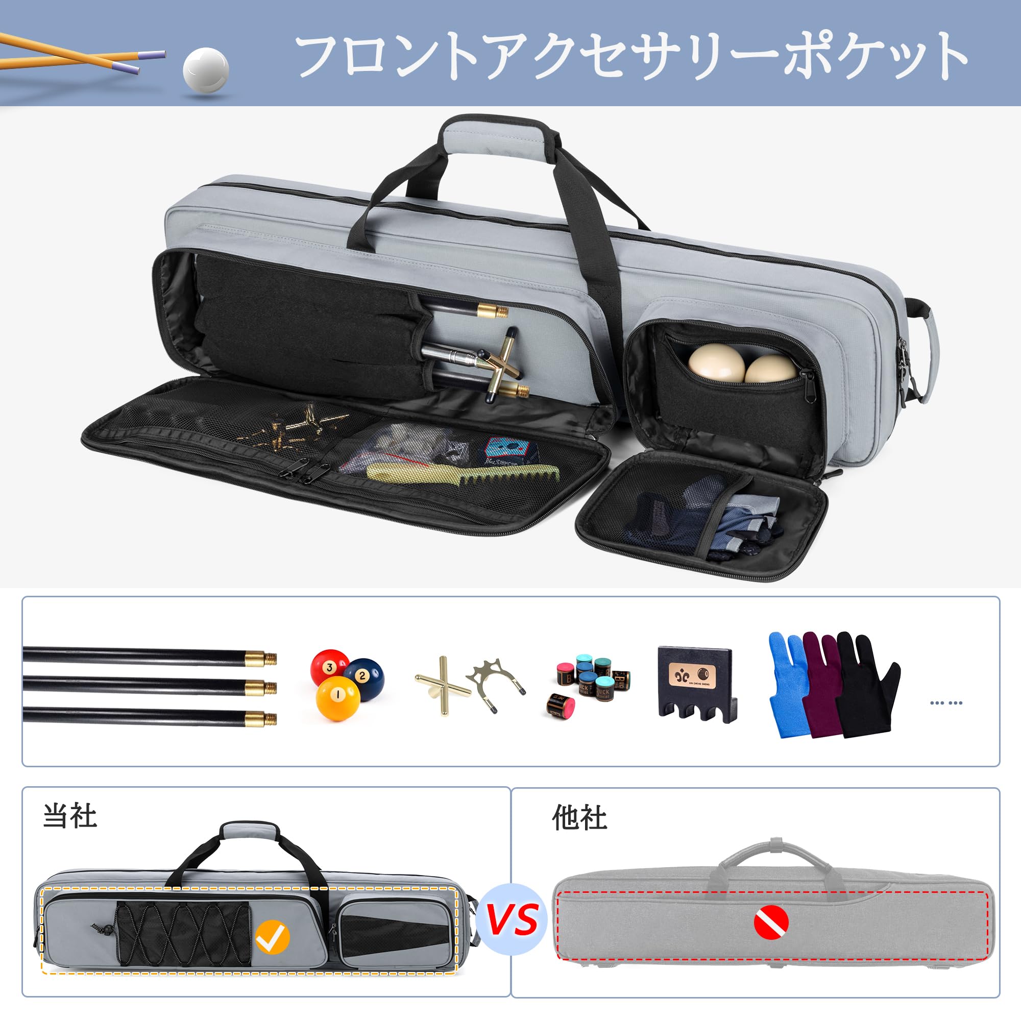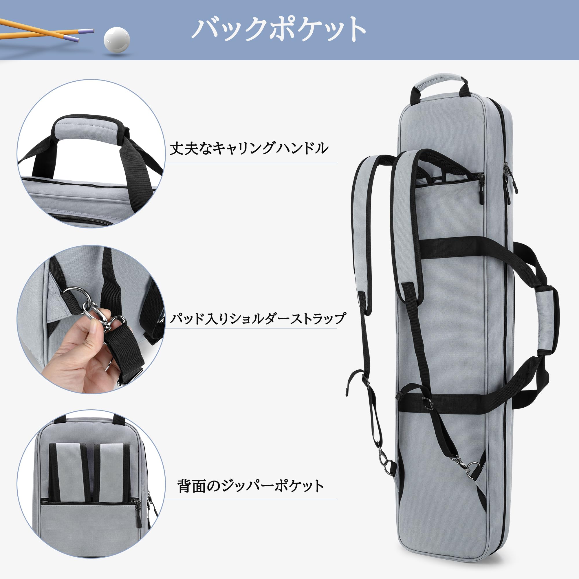 【複数のポケット】独立したパッドが付いた大きなフロントポケットにはビリヤードスタンドを収納でき、メッシュポケットには小さなアクセサリーを収納できます。小さなパッド入りジッパー付きポケットには手球が2個入ります。