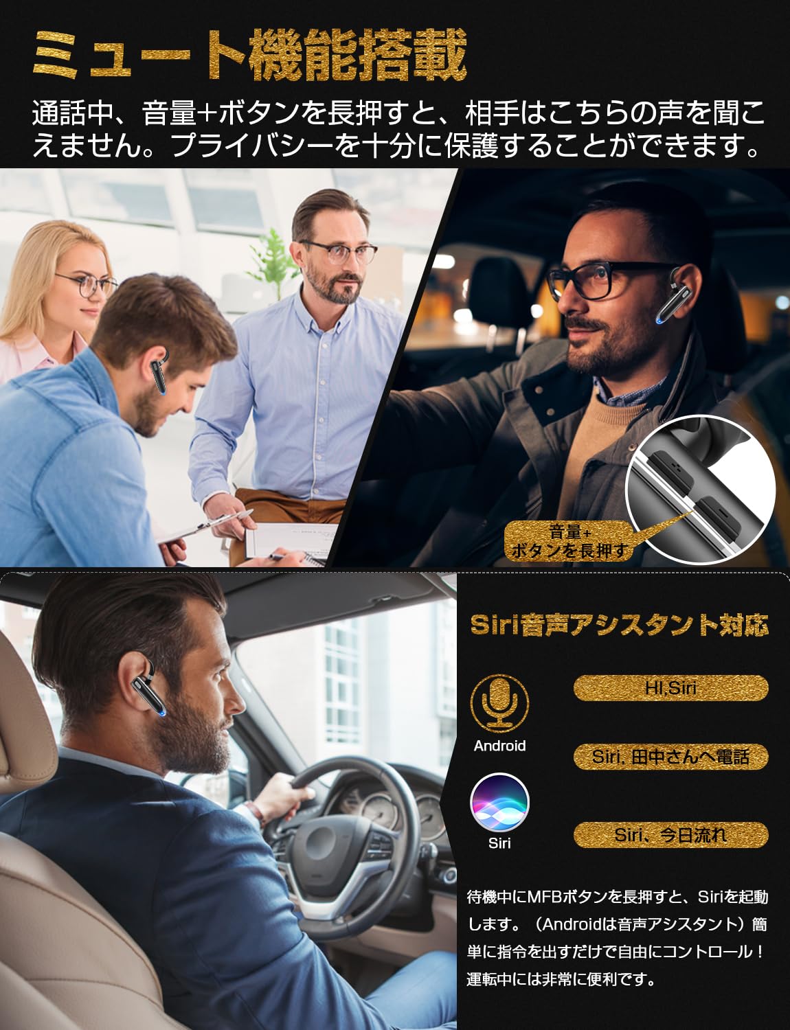 ??【ハンズフリー通話専用マイク搭載・ミュート機能】のBluetoothヘッドセットは単一指向性マイクとCVC8.0ノイズキャンセリング機能が搭載により、正確に声を拾い、周囲からのノイズをブロックし、よりクリアな通話を実現でき、騒がしい場所でも相手にクリアな音声を届けます。更に、マイクを口元に近づけやすくなるスティック型ですので、明瞭な音声通話を実現し、テレワークやWeb会議にも役立ちます。お客様のプライバシーを最大限度に保護するために、ミュート機能も搭載されており、通話中、「?量−ボタン」を?押すと、こちらの声は相手に聞こえなくなるため、会議中など、機密情報を扱う場合に助かります。Siri機能にも対応しているので、運転中に音声コントロールを起動できます。オンライン会議、運転や家事、荷物配達などの忙しい場合から両手を解放できます。??