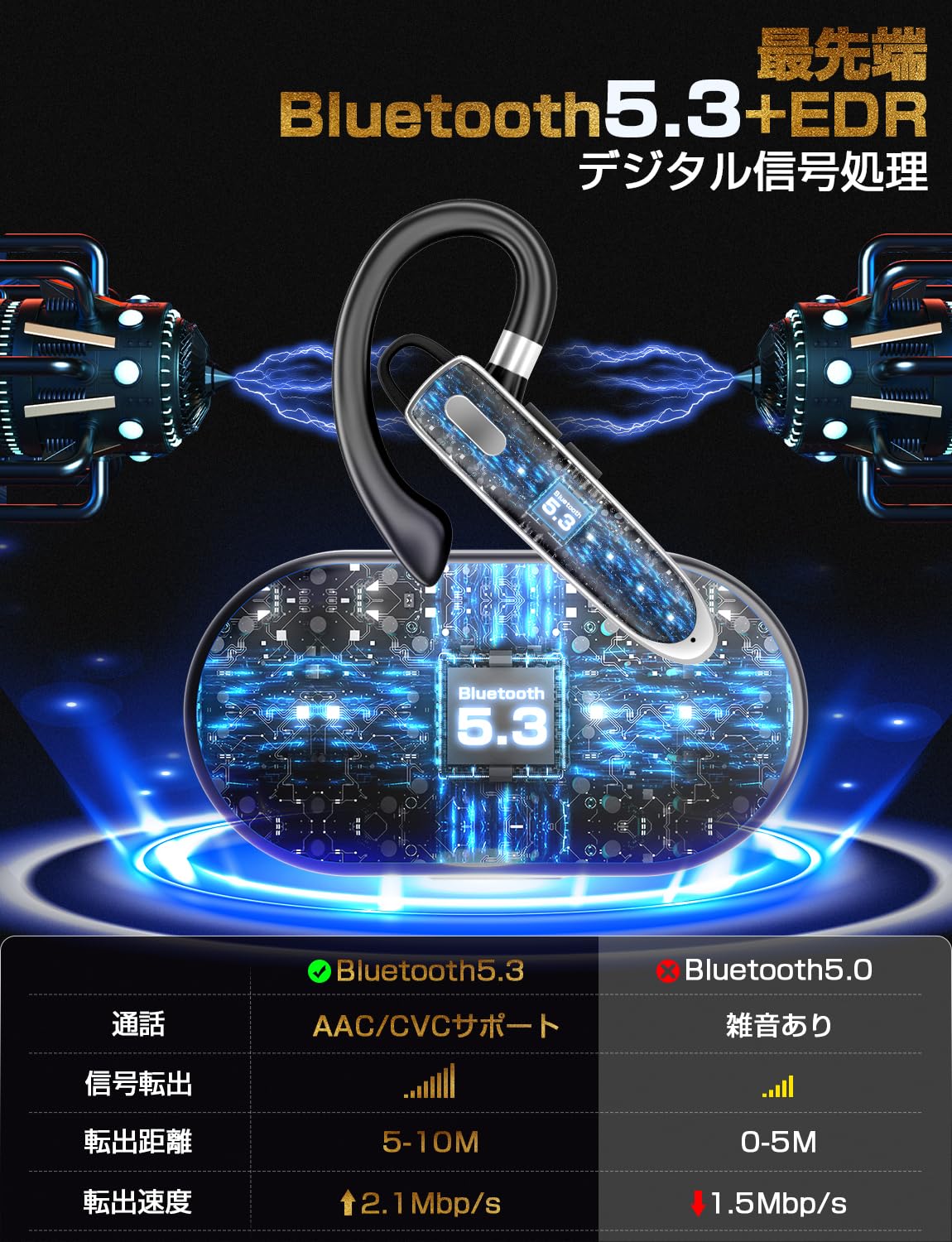 ?【業界先端Bluetooth 5.3&CVC 8.0ノイズキャンセリング】業界最先端Bluetooth 5.3チップを搭載し、ぶつぶつと途切れることもなく高速で安定した通話品質を実現して、「音飛び」や「音切れ」を大幅に改善することができます。片耳型なので、両耳を塞がず、通話しながらも周囲の状況を把握できます。さらにマイク部にはCVC8.0ノイズキャンセリング機能も付いているためこちらの声もクリアな状態で届けます。??相手側のノイズもかなり低減して鮮明に聞き取ることが可能です。音質向上のためのデジタル信号処理から、安定したBluetooth接続のためのアンテナの位置など、細部までこだわって設計されています。また満員電車やバスなどで音楽を聴くのに利用する際もケーブルを気にすることなく利用できるため、混雑した状況でも快適に音楽を楽しめます。