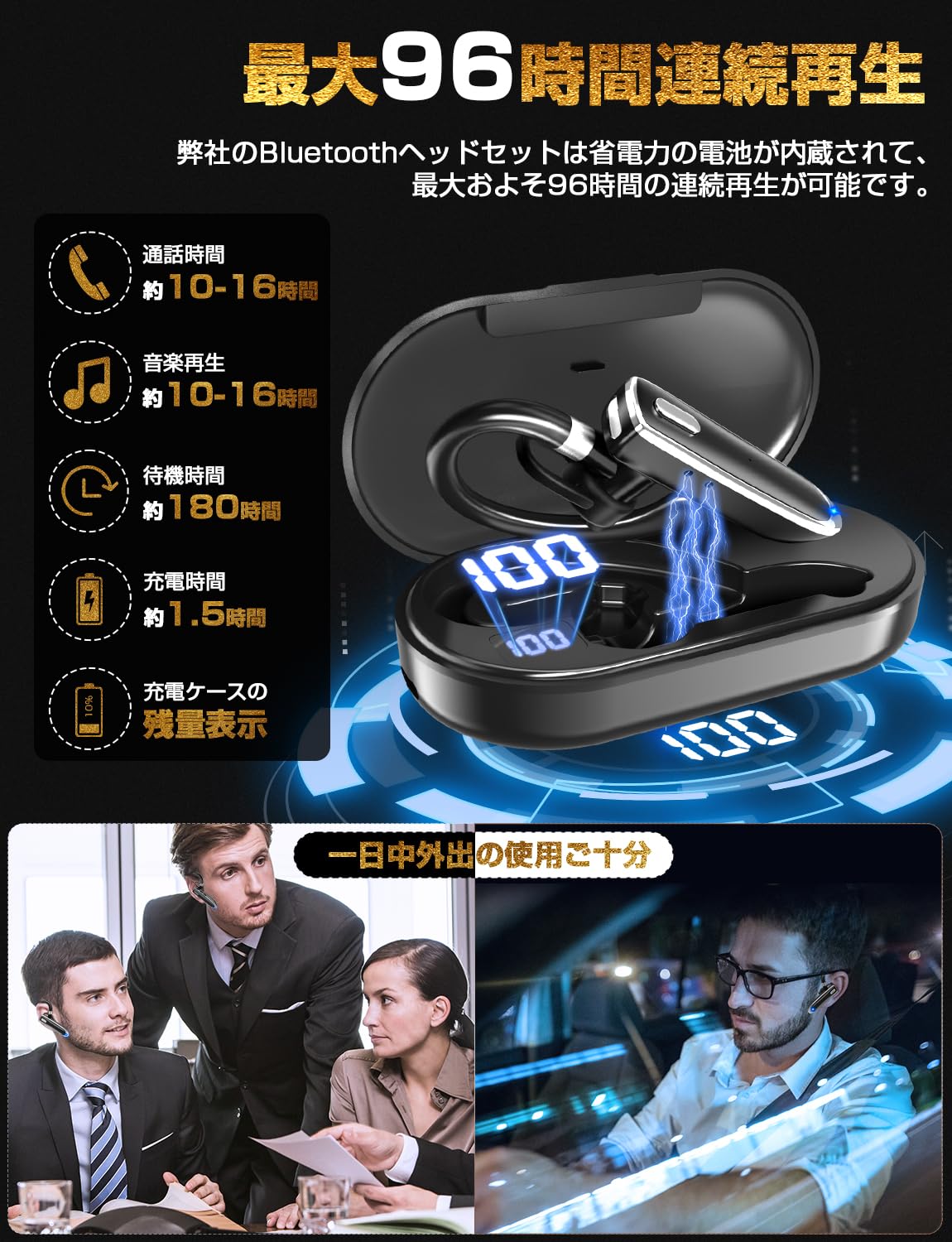 ????【最大96時間連続再生&大容量充電ケース付き&LEDバッテリー残量表示】テレワークの普及に伴って、必要性を増してきたweb会議。時には長丁場となるweb会議を、ストレスなく進めていきたい方が多いです。お客様の声を集めて、のBluetoothヘッドセットは省電力の電池が内蔵されて、最大およそ96時間の連続再生が可能です。収納ケースが付いていて、長時間通話していても電量不足になる心配がありません。LEDランプが付くので、バッテリー残量を数字で一目で確認出来ます。Type Cケーブルで約1.5時間でフル充電になり、本体連続再生は10-16時間可能です。また充電ケースと併用すれば合計で約96時間の長時間使用が可能です。(ご注意:再生時間は充電時間、音量調整、再生内容、使用環境、個人使用習慣、接続デバイスなどによって異なる場合があります。)