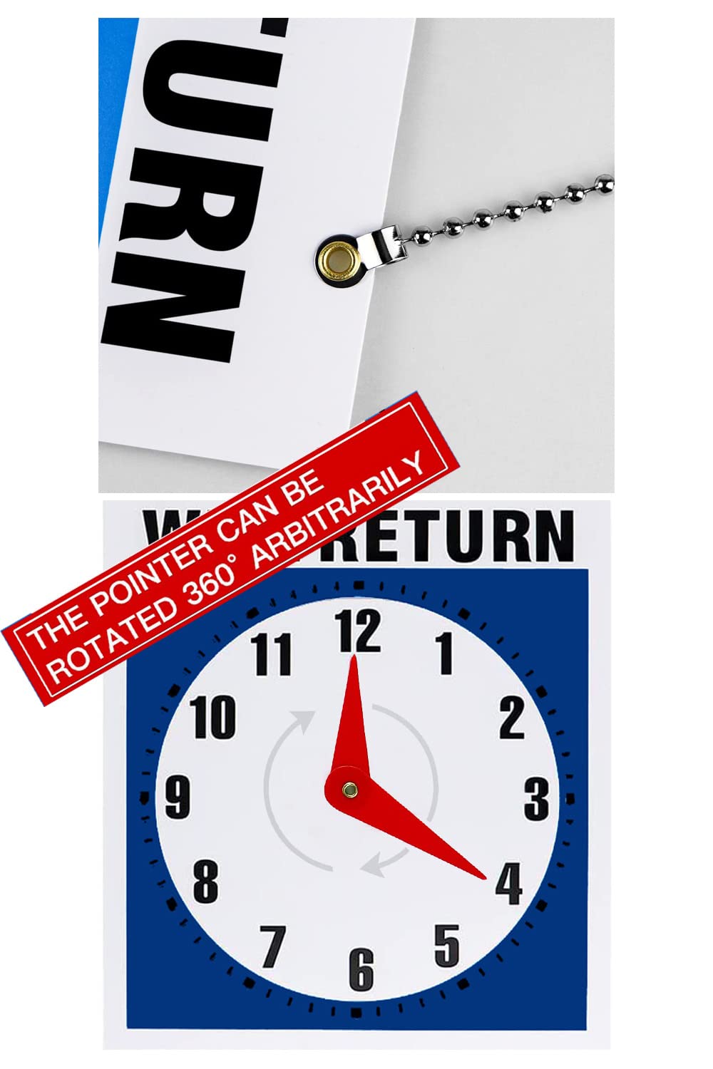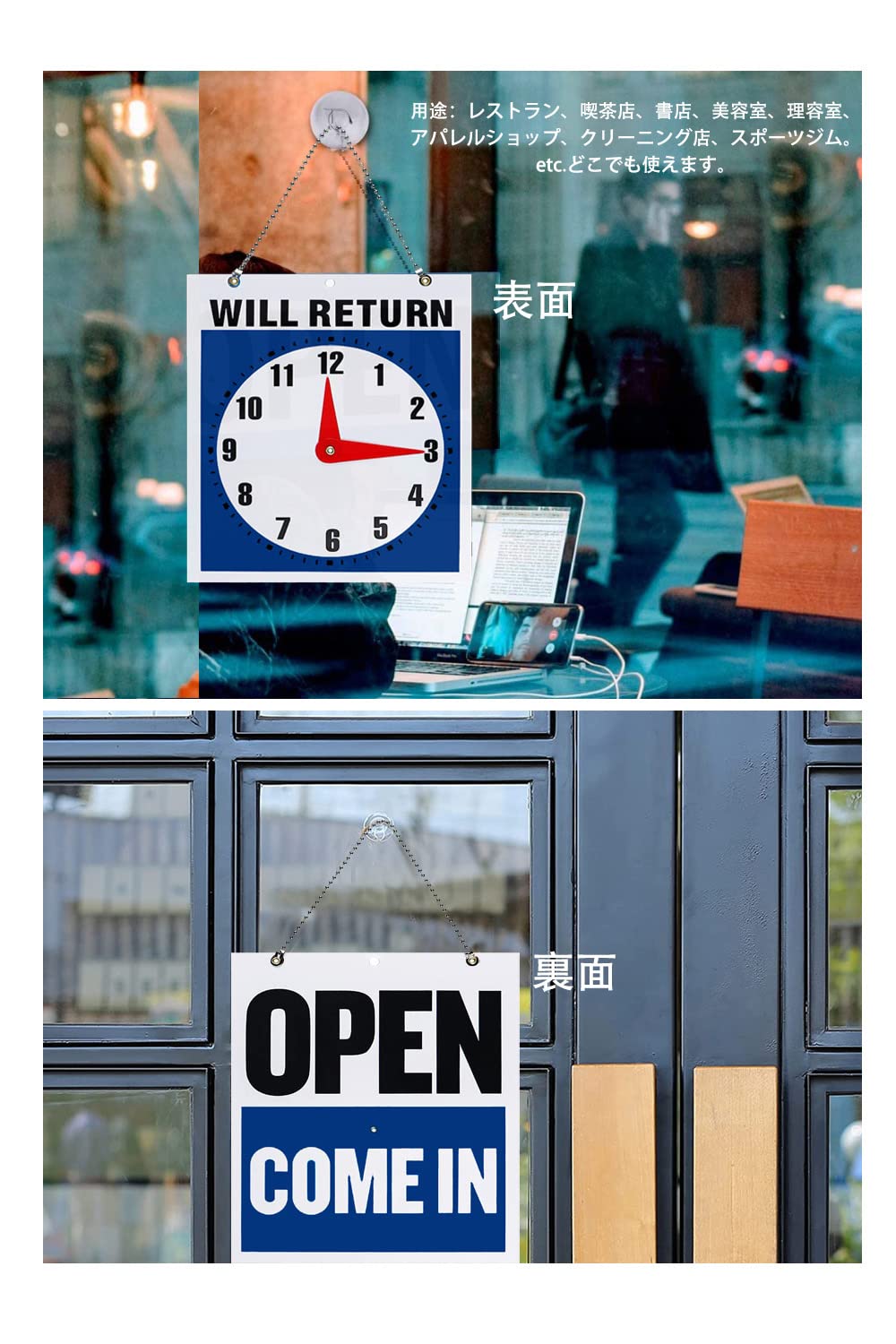 1.おすすめポイント:表面は時計と「WILL RETURN」、裏面は「OPEN COME IN」の両面使えるデザインです。「時針と分針」が表示された開店営業中、帰宅時間や翌日又は翌営業日の開店時間や営業開始時間のお知らせができるサインプレートです。