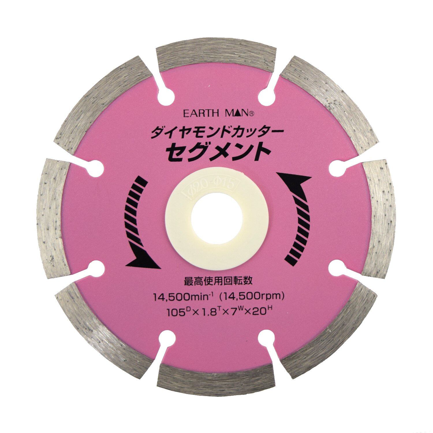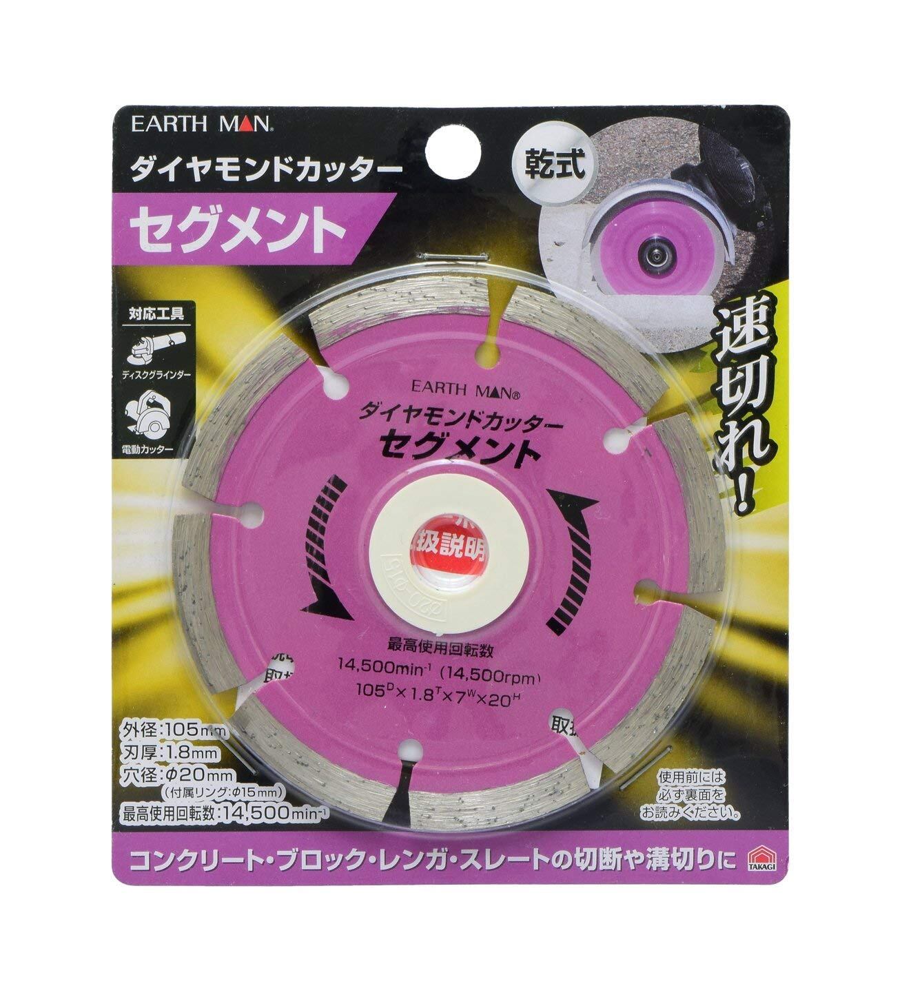 高儀(Takagi) EARTH MAN ダイヤモンドカッター 乾式 速攻シリーズ セグメント シルバー 105mm コンクリート・ブロック・レンガ・スレート・建築石材の切断に 外径:105mm 刃厚:1.8mm 穴径:φ20mm(付属リングφ15mm) 最高使用回転数:14500min-1 コンクリート・ブロック・レンガ・スレートの切断や溝切りに 速切れ