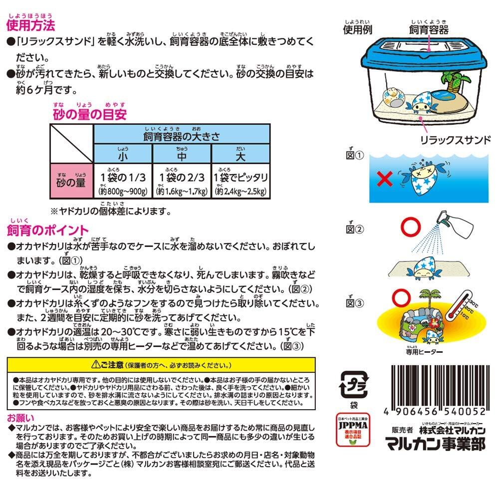 「リラックスサンド」を軽く水洗いし、飼育容器の底全体に敷きつめて下さい。砂が汚れてきたら、新しいものと交換して下さい。砂の交換の目安は約6ヶ月です。