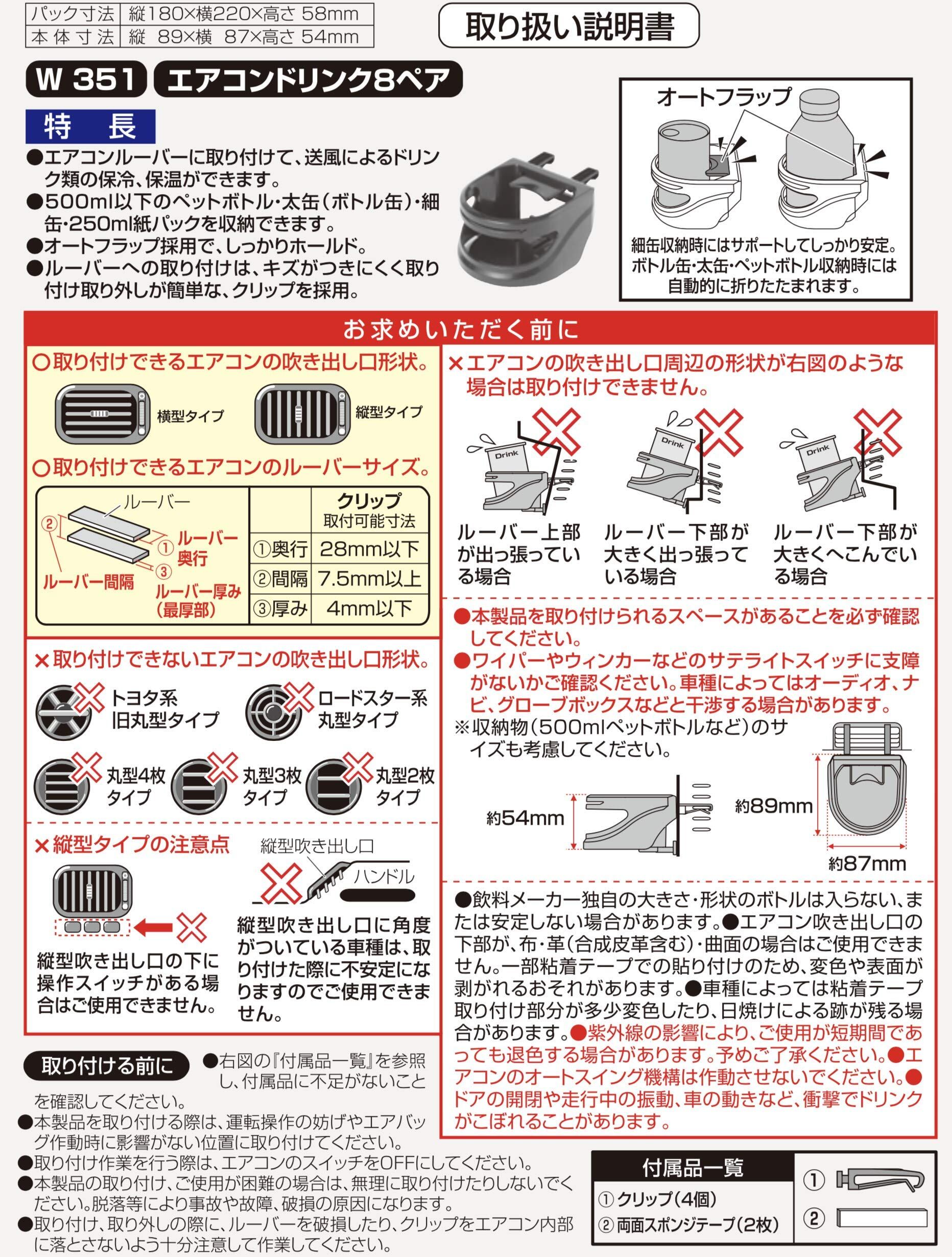 セイワ(SEIWA) 車内用品 ドリンクホルダー エアコンドリンク8ペア 2個入り ブラック W351 生産国:中国 材質・素材:ABS 内容数:2個 ●エアコンルーバーに取り付けて、送風によるドリンク類の保冷、保温ができます。 ●オートフラップ採用で、ペットボトル(500ml)・太缶・細缶を入れるだけでしっかりホールドできます。