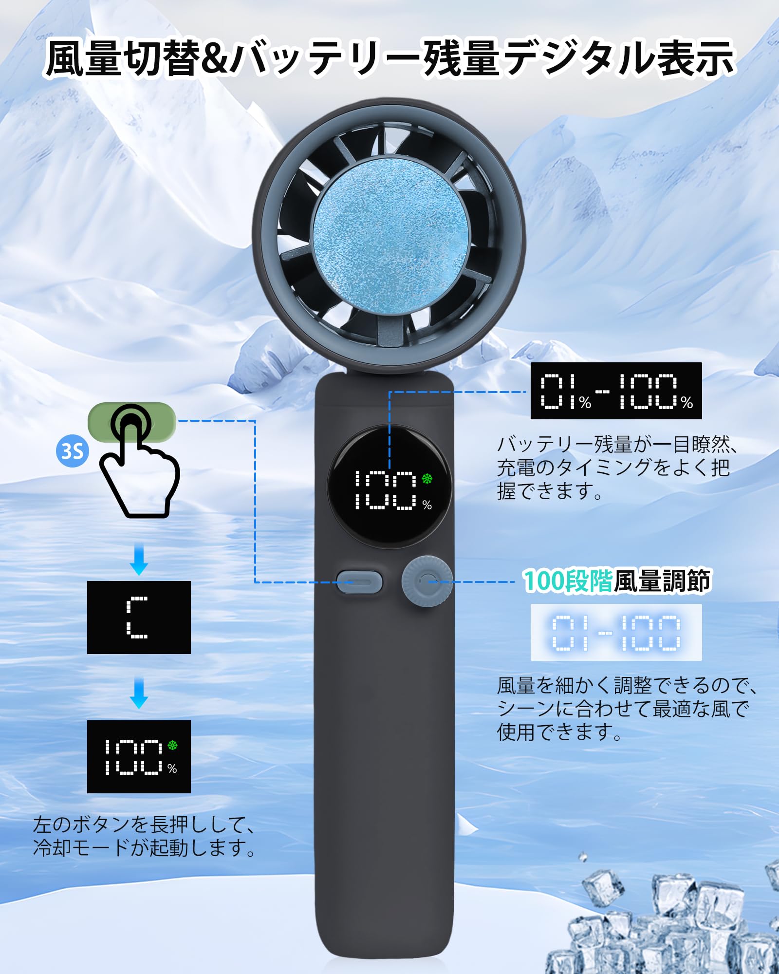【在庫処分】ハンディファン【2025年革新モデル・-20℃瞬間冷却】携帯扇風機 冷感プレート付き 手持ち扇風機 1〜100無段階風量調節 LEDディスプレイ 5000mAh大容量 長時間連続 Type-C 充電式 小型軽量 手持ち/卓上/携帯 ストラップ付き 熱中症対策 ダークグレー