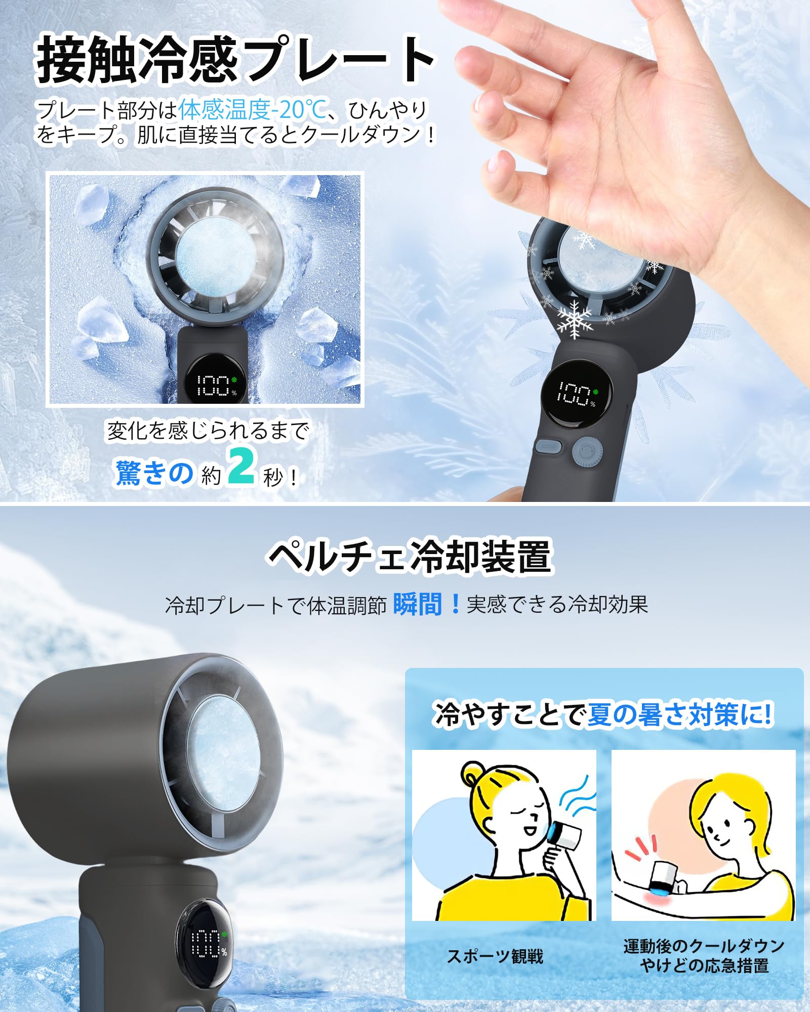 【2025年夏最新モデル&冷却プレート付き】手持ちファンの握り手は人体工学デザインで、手触りが心地良く、片手操作も簡単です、デスクに置きでも使用いただけます。ミニ軽量設計で持ち歩きも楽々。他のモデルにはない台座付モデル、手持ち扇風機・卓上扇風機・携帯け扇風機三つの機能を同時に兼ね備えています。新しいトレンドを導く半導体熱交換技術を採用し、電源ボタンを長押しするだけで約1秒後に冷却スタートし、体感温度は最大20℃まで下がります。首、頬、額などに当てると肌が瞬時に冷え、冷却機能とファンの二重構造で暑い夏での必需品です。
