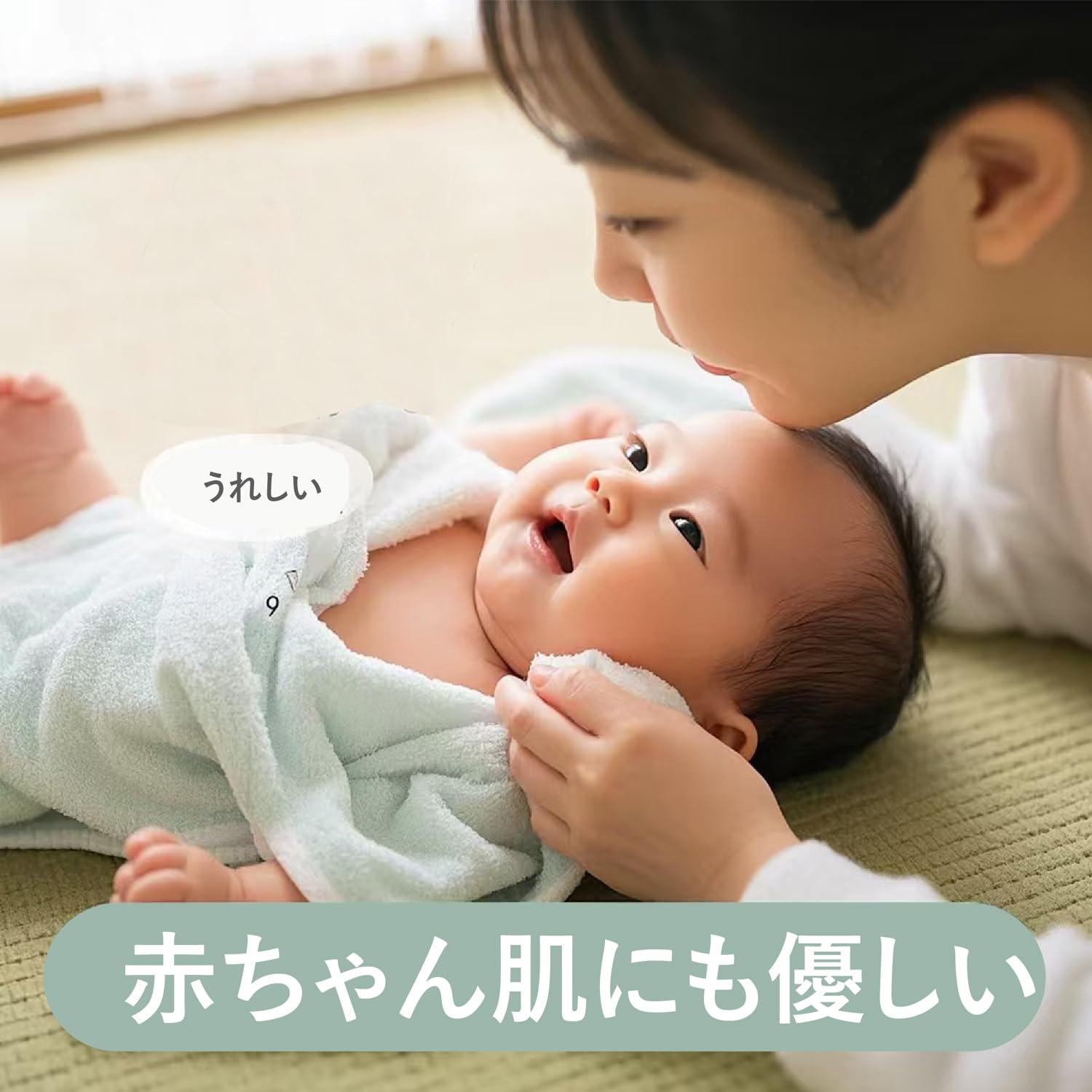 【肌触り柔らかい】柔らかな肌触りで心地よく、通常のタオルより細番手の上質糸を使用し、繊細な柔らかさが生まれます。ふかふかの起毛タイプなので、成人だけではなく赤ちゃんでもお肌を優しく包み込んでくれます。材料の良さを引き出すため、蛍光染料は一切使えず、ナチュラルな色合いに染色しています。