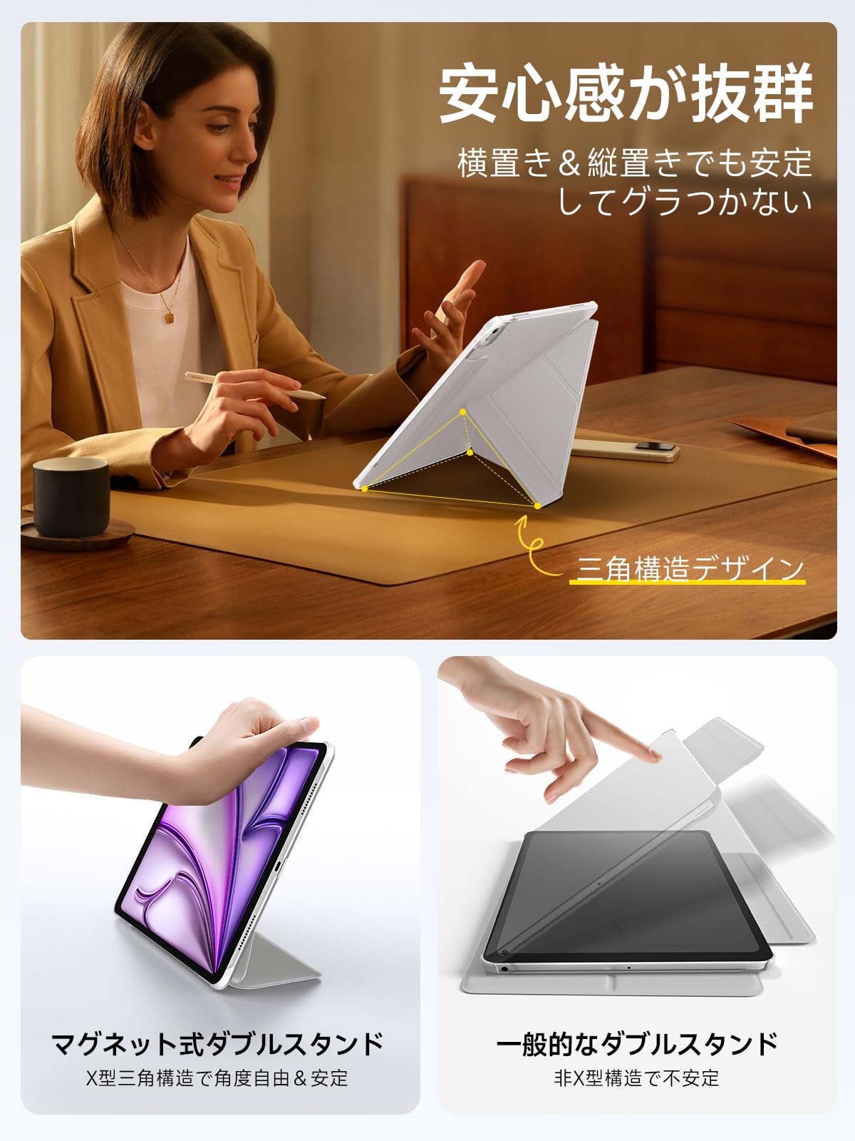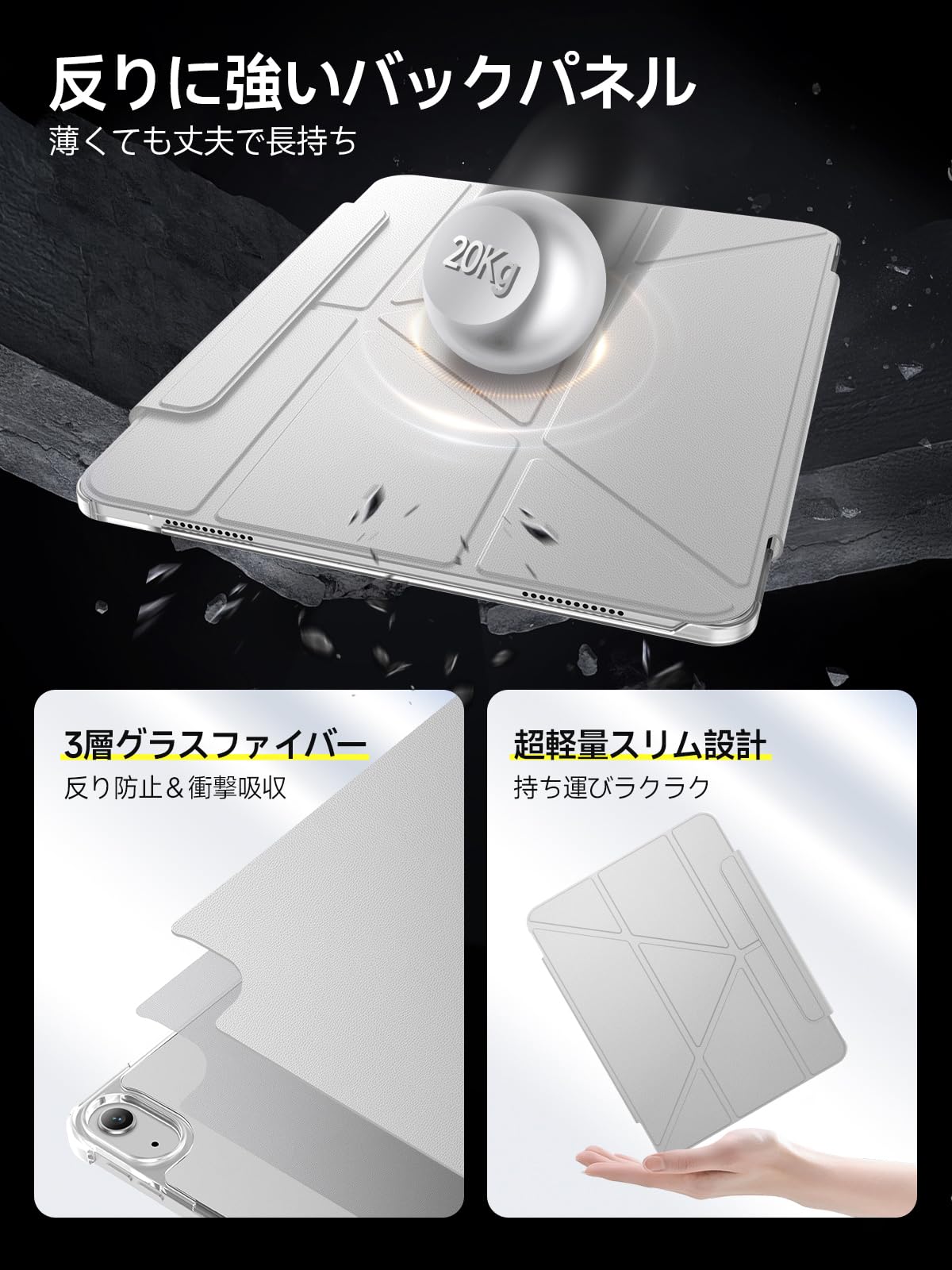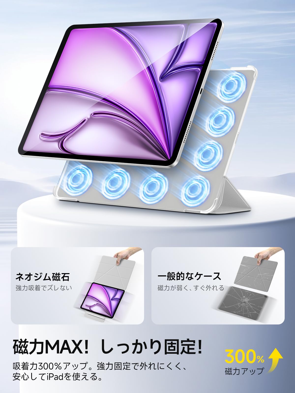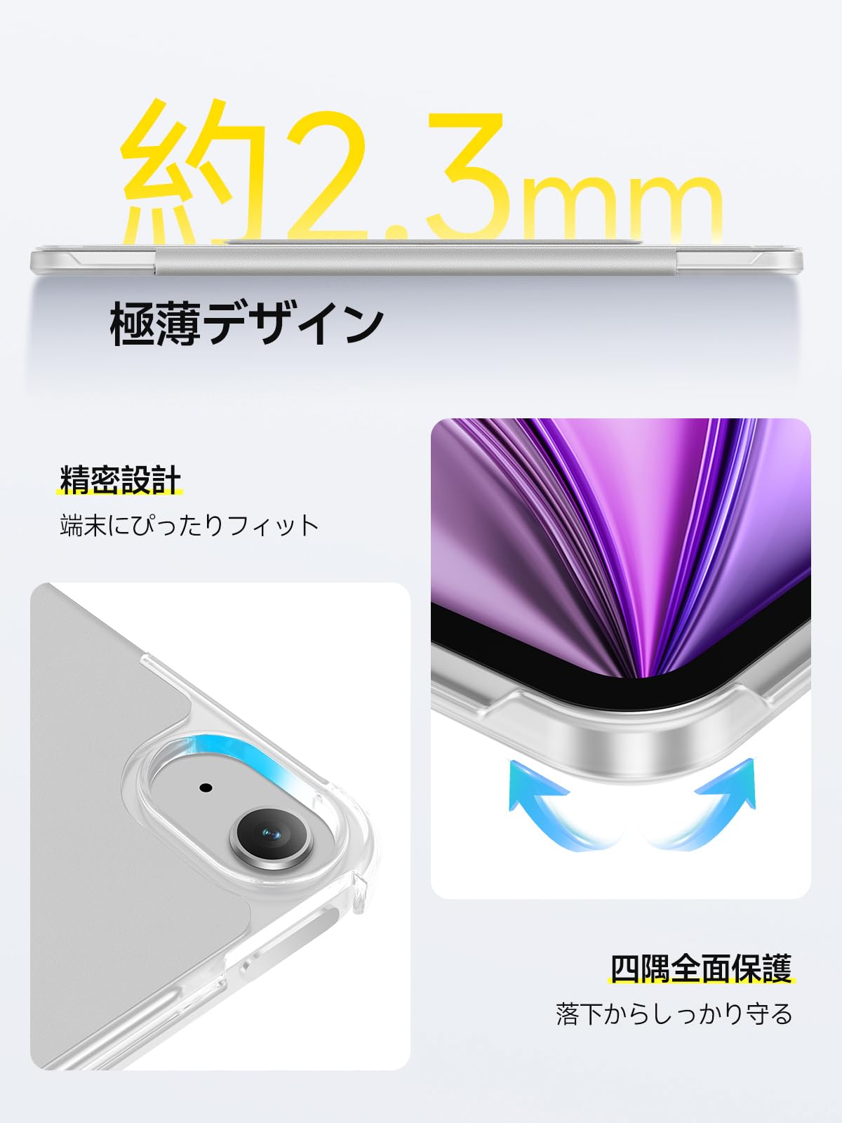【磁気吸着&360°全面保護】 背面に強力マグネットを内蔵し、ケースが本体にしっかり密着。カバーの開閉で自動スリープ/ウェイクに対応。四隅強化に加え、360°全周を包み込むフルカバー設計で、落下衝撃、摩擦、埃や指紋からもしっかり守ります。