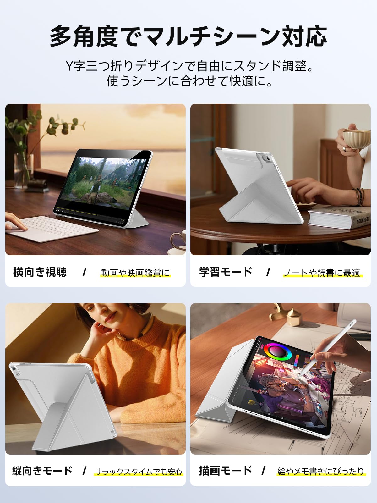 【Y字折り構造スタンド】 独自のY字折りデザインで、縦置き・横置きの両方に対応。動画視聴、オンライン授業、読書、タイピング、イラスト制作まで幅広く活躍。4段階角度調整で快適性を追求しました。