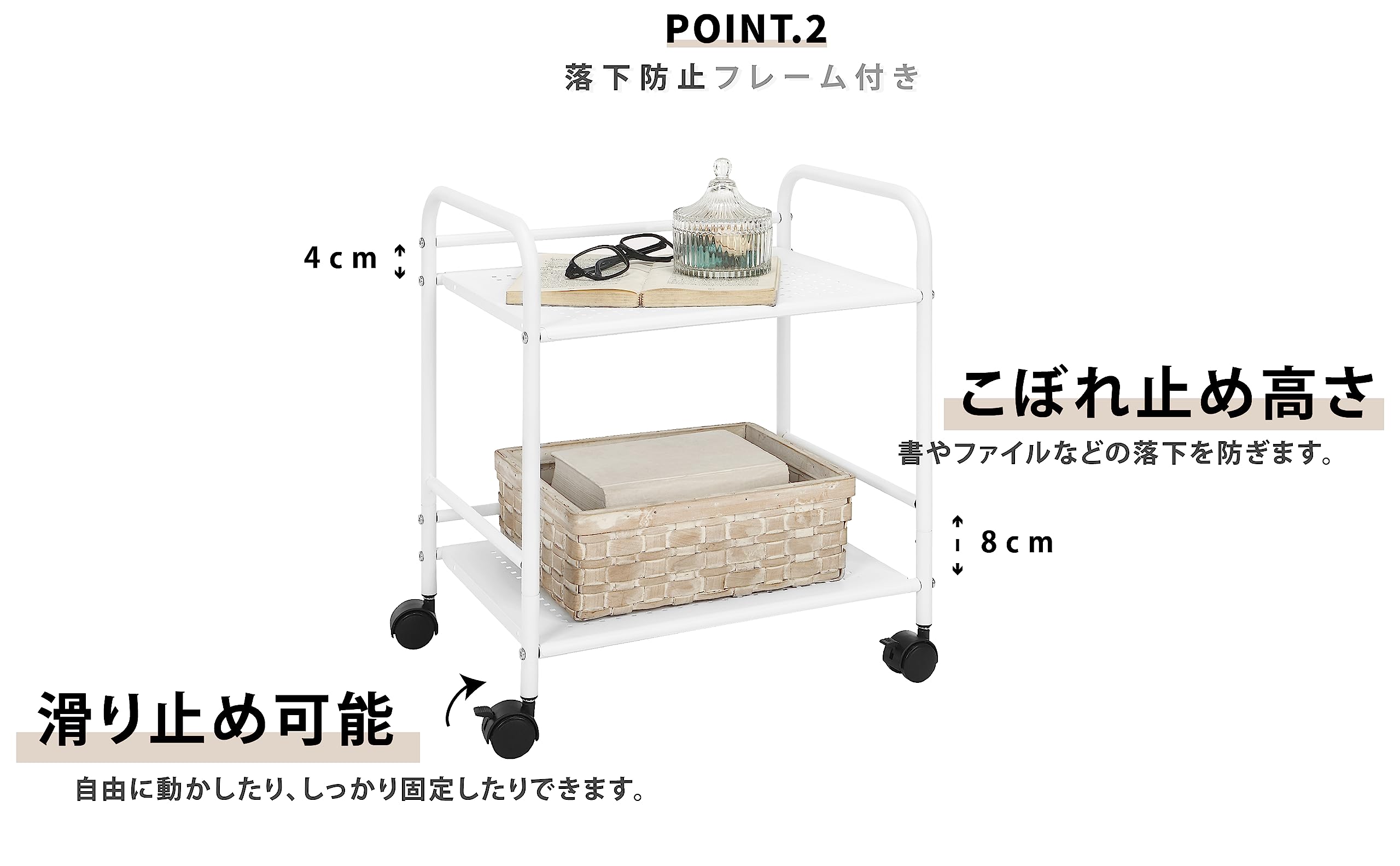 【移動・固定ラクラク】前2個キャスターにはストッパー付きで、ラックが固定し設置出来ます。ハンドルもあるので、移動がラクラクで様々な場所でも使いやすいです。また、床からラックの下段まで約5CM高さがあり、掃除が便利です。