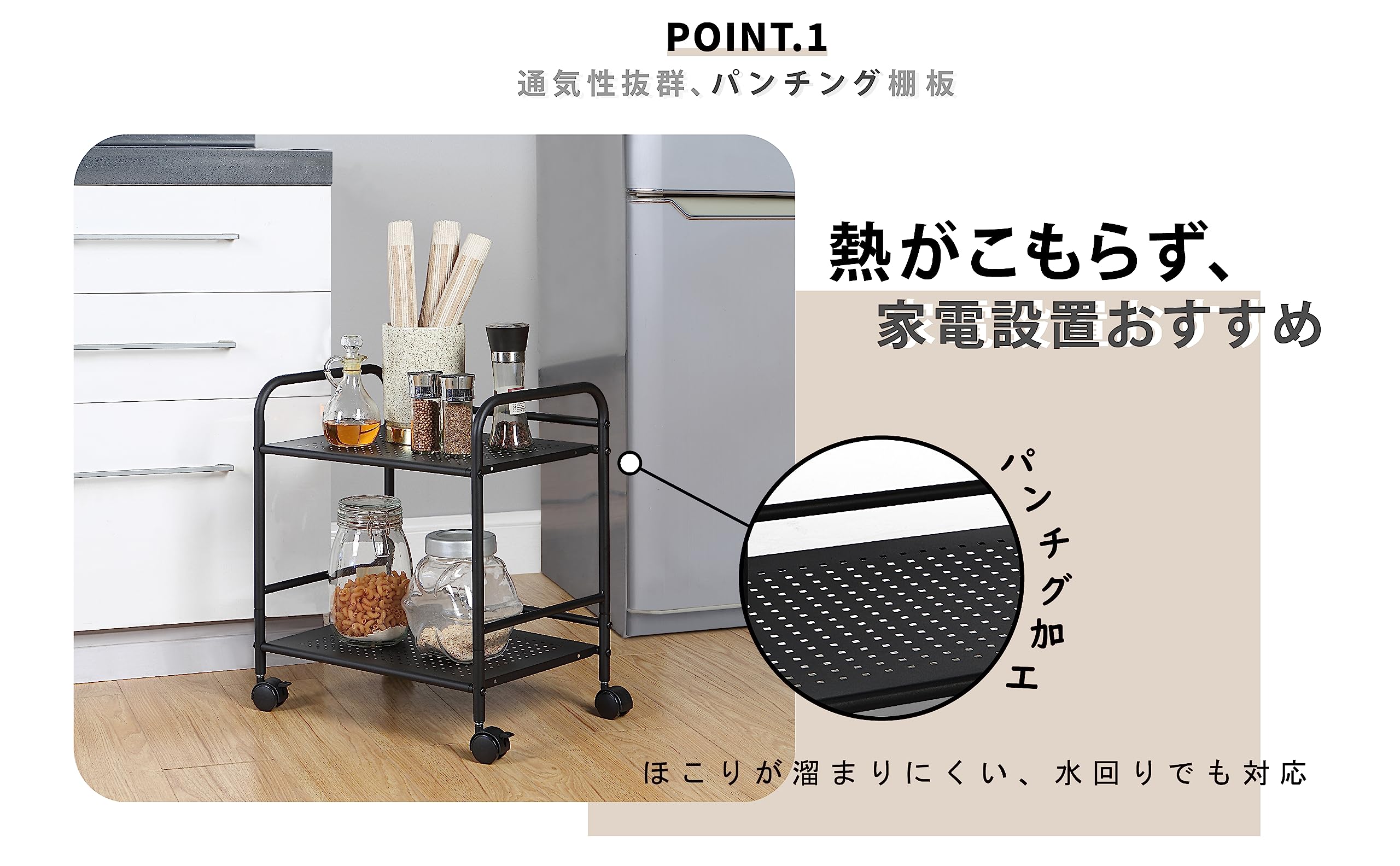 【仕様】スチール製/組立品-約15~20分/粉体塗装-マット仕上げ;パンチング棚板を採用され、ほこりが溜まりにくいです。通気性がよいし、家電製品の熱もこもりません。