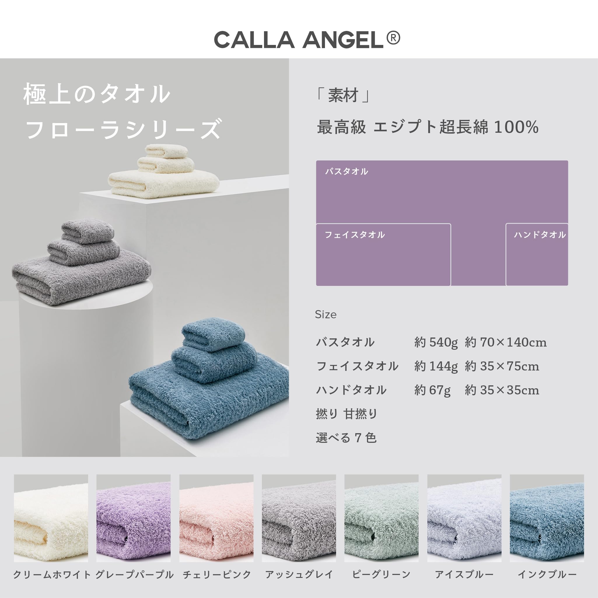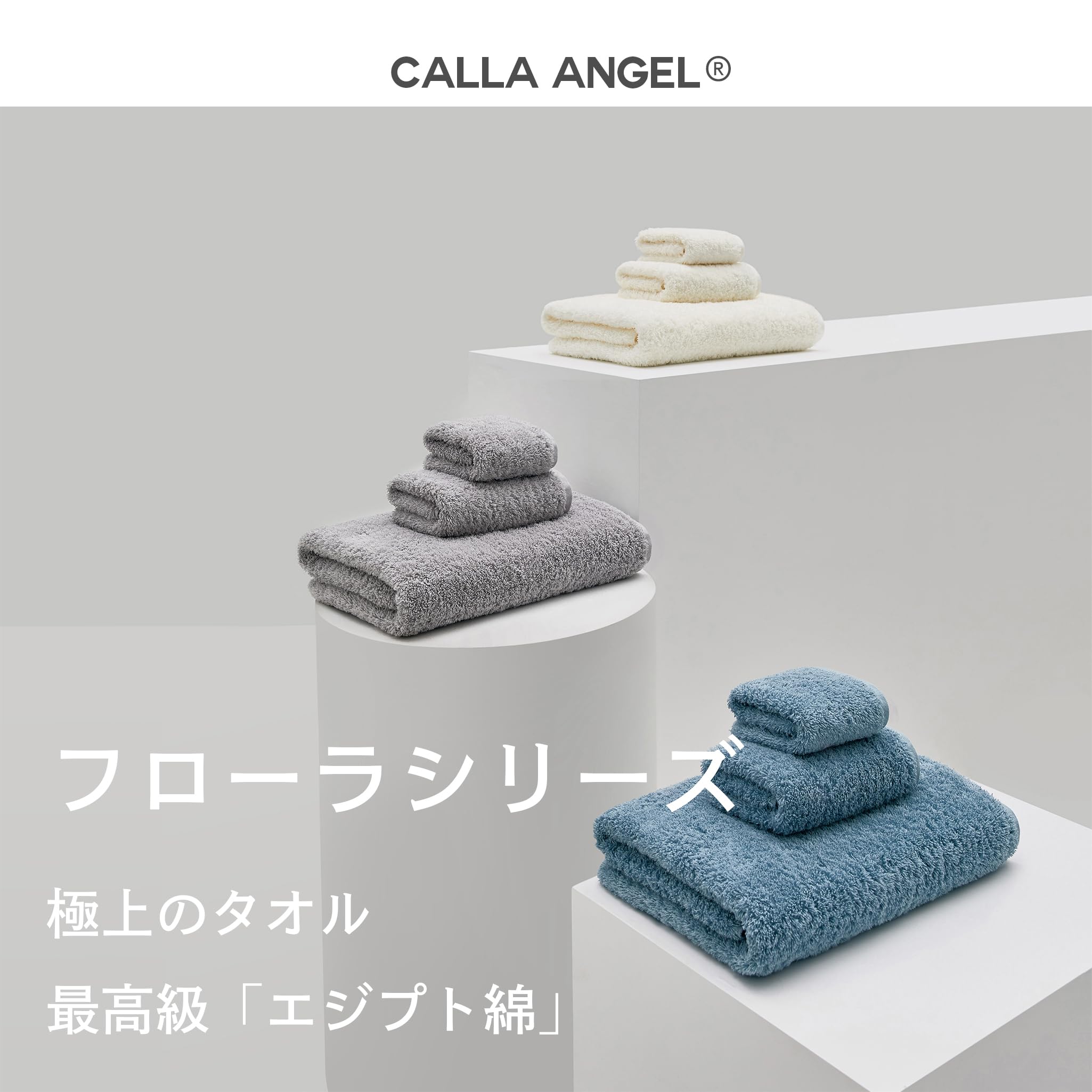【最上級のラグジュアリータオル】 素材・加工・織りすべてにゆっくり時間をかけて品質にこだわったボリューム感あふれる高級タオル。海外でも人気のNew Yorkブランド「Calla Angel」のフローラシリーズ、世界に誇れる確かな品質のタオルです。素材:100%手摘エジプト綿Giza86 / フェイスタオル: 約145g 約35×75cm