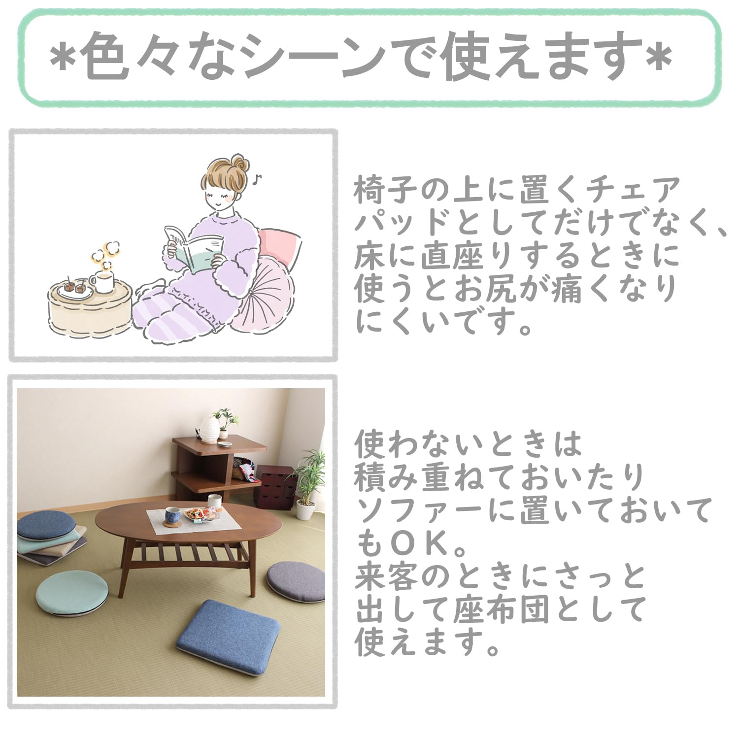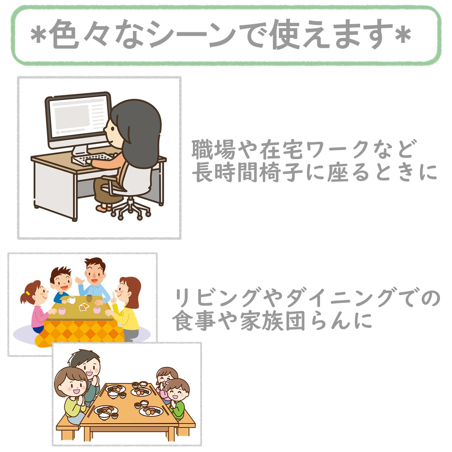長時間のデスクワークやドライブに。リビングなどの床に直座りする時に使用するとお尻が痛くなりにくいです。