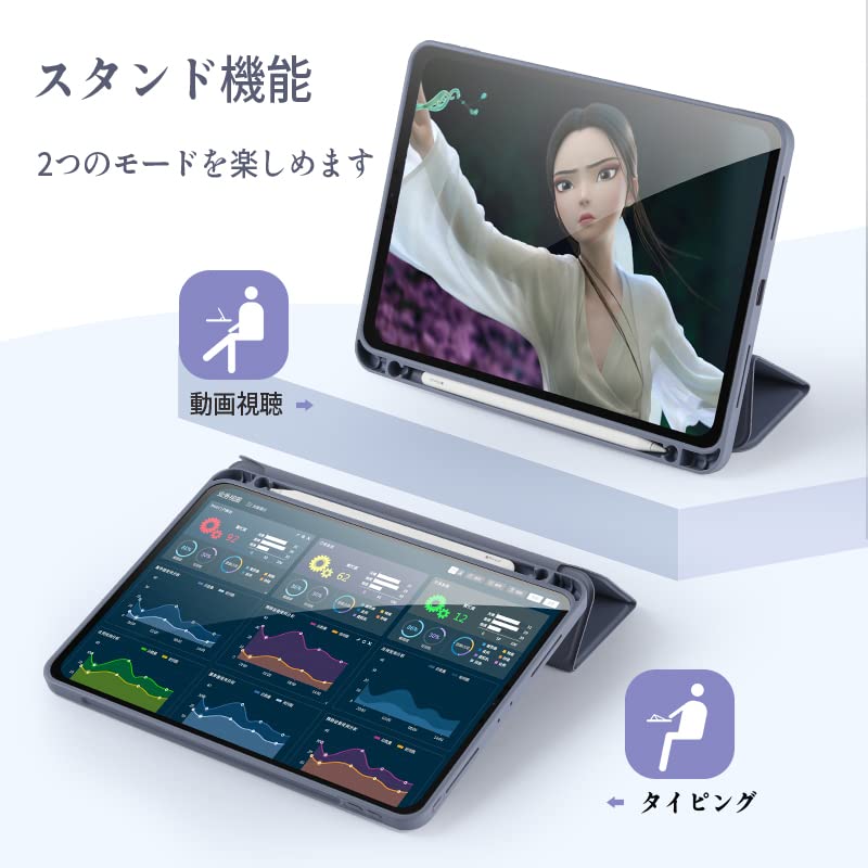 【スタンド機能】3つ折りスタンド機能で快適な視覚に調整できます、2つのモード「動画視聴」や「タイピング」を楽しめます。動画視聴スタンドでは手を解放します、タイピングスタンドでは快適なタイピングや絵画ができます。