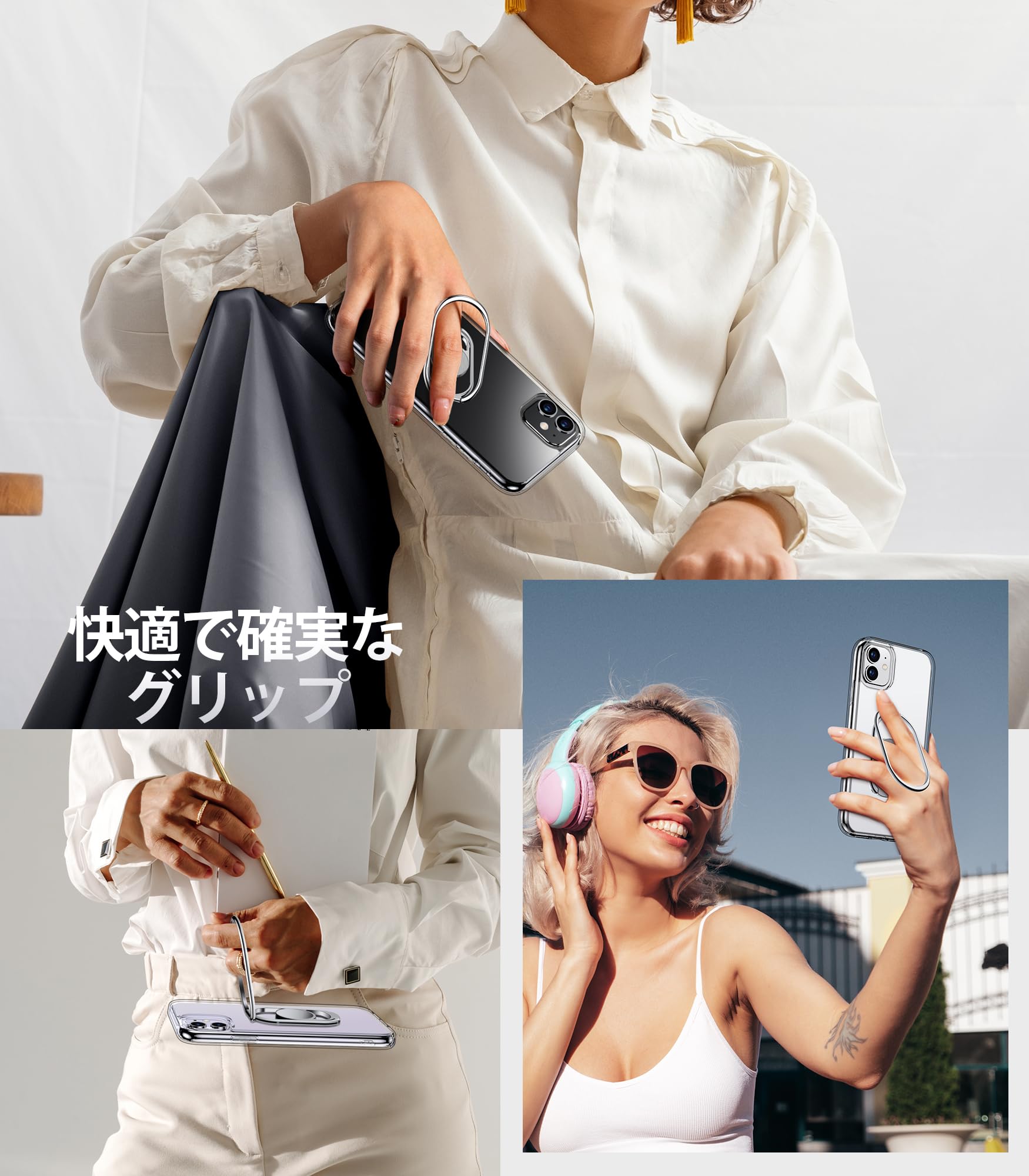【転倒防止と片手操作】さまざまな状況で簡単に適応でき、安全なグリップとしても機能します。混雑したバスの中や写真を撮る際に、このグリップで携帯を片手でしっかりと持つことができ、事故による落下を防ぎます。