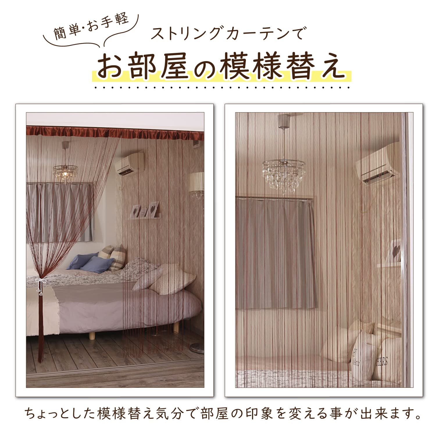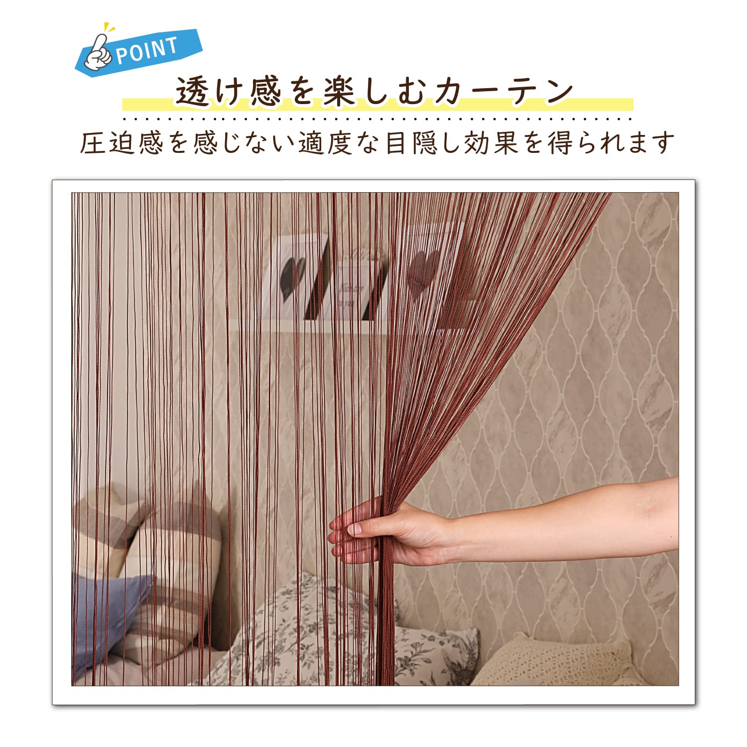 【透け感のある糸カーテン】:透け感があり圧迫感を抑えて空間を仕切れるストリングカーテン。