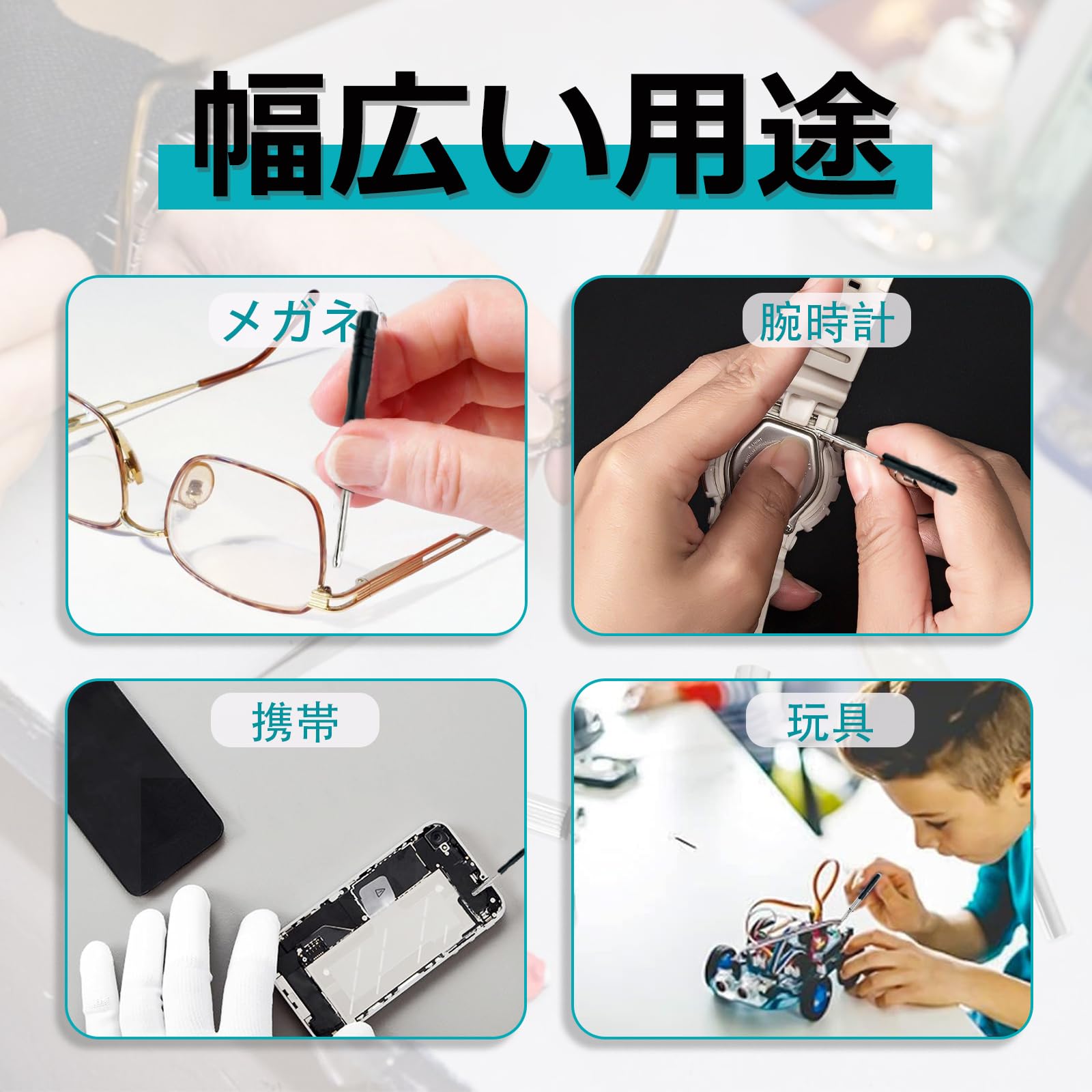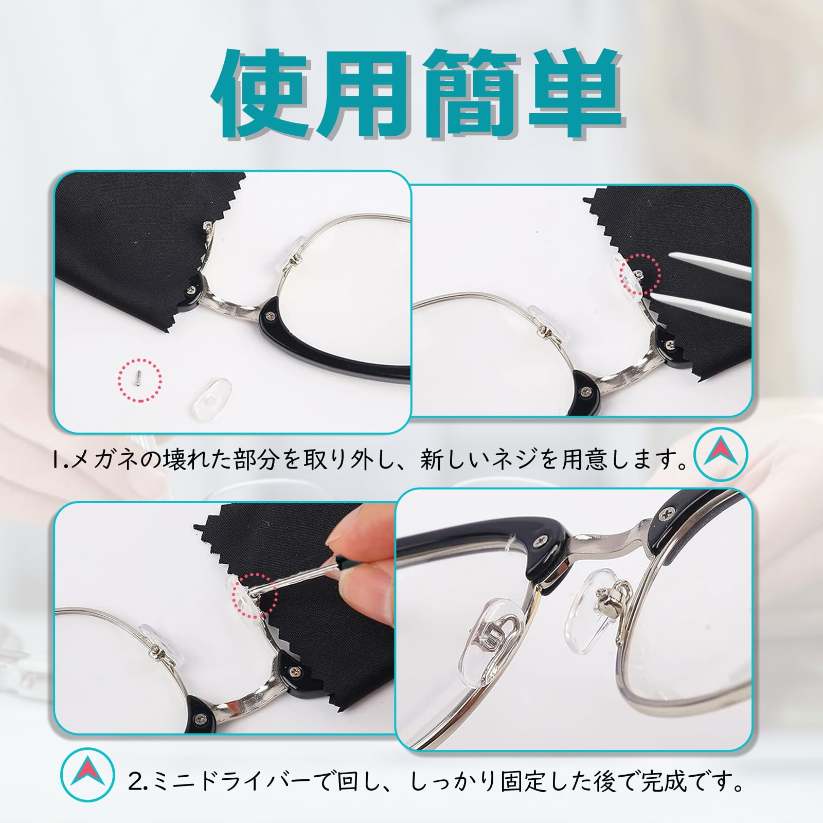 【使用簡単】まず、メガネの壊れたアクセサリーを取り外し、新しいネジを用意します。そして、ミニドライバーで新しいネジを回し、しっかり固定した後で修理完成です。 【ご注意】眼鏡は滑りやすいなら、布で包んだほうがいいです。ネジは小さいから、根気よく取り付けてください。