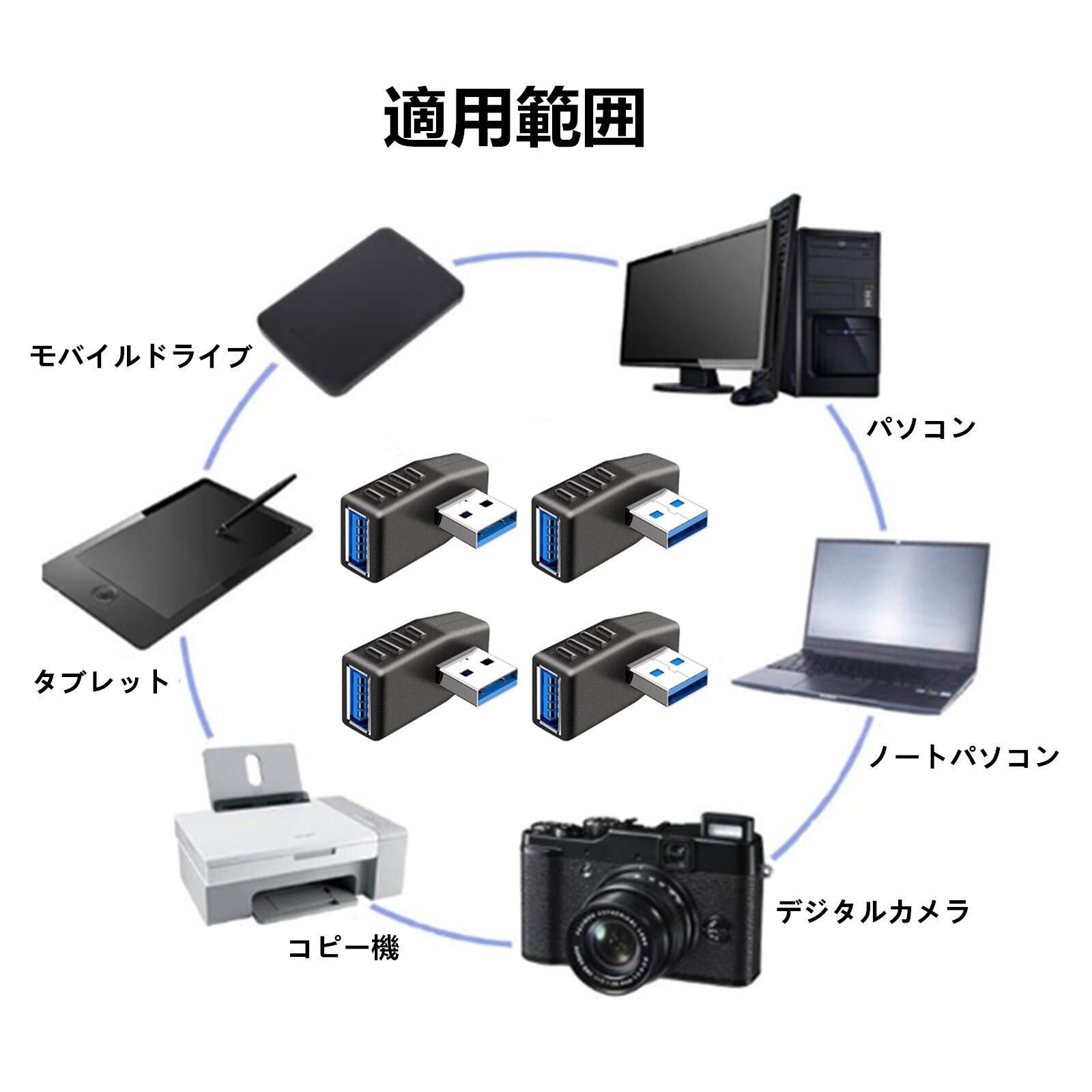 【角度変換/方向変換に】異な向きの4個セットです。角度変換、方向変換,右または左に曲がる。USBメモリなどの方向を変えられるため、省スペース可に役立ちます。方向を90度変え、狭い場所でも簡単に接続できます。