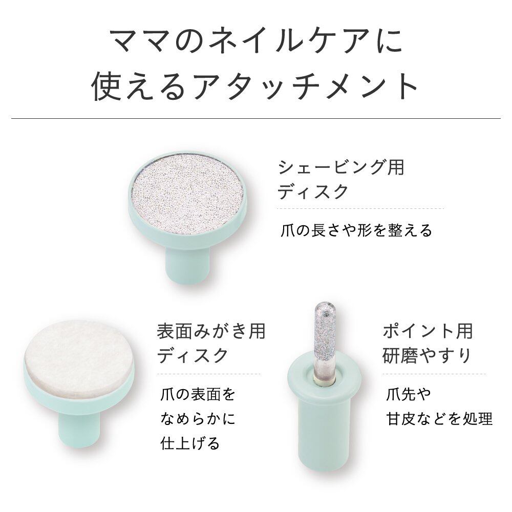 ●ベビーとママ用アタッチメントが付いた6タイプのネイルケアセット。