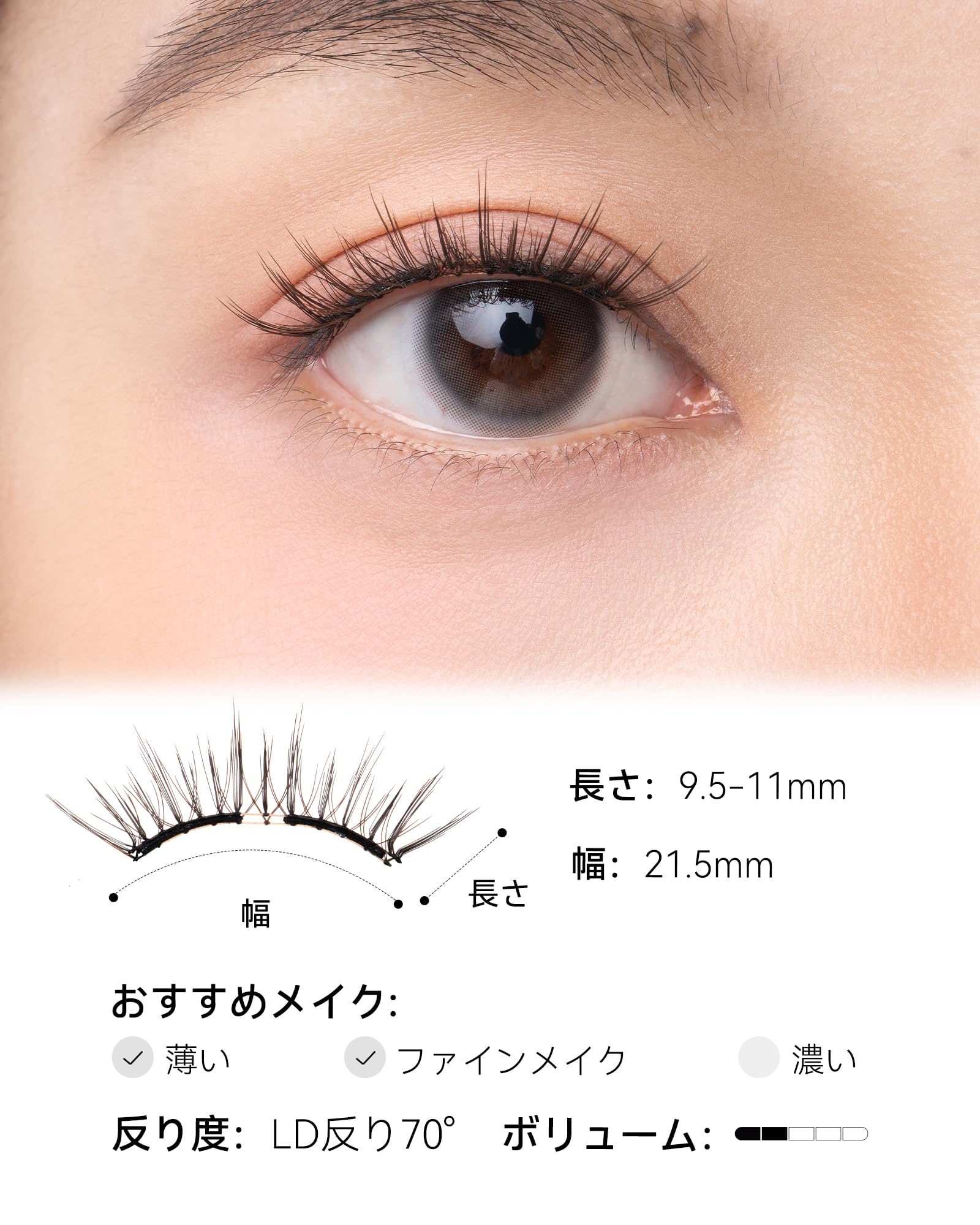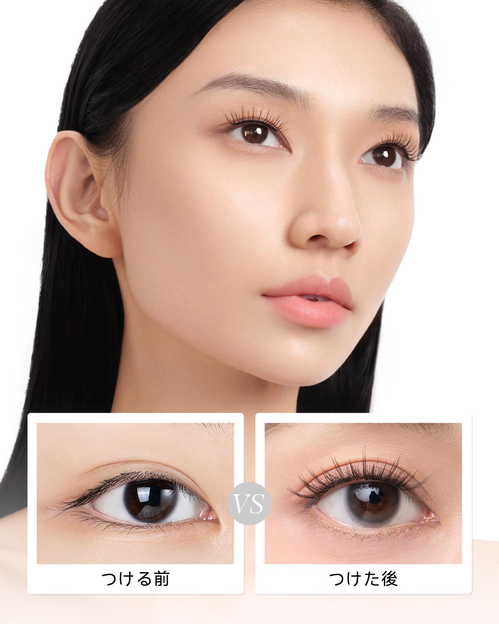 良質な動物実験フリー素材:動物実験フリー、清潔で、軽く、独特で快適。厳選した動物実験フリー素材による快適さ、柔らかい装着感を目に与えます。たっだ0.034gのつけまつげは、羽のようにふんわりで、目に呼吸感を与え、最高な快適さを手に入れます。(Tips:目はデリケートなので、つけまつげをつけたら、慣れるまで一定の時間が必要です)