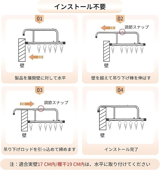 【伸縮自在で大容量物干し 】物干し竿は二重ケース構造を採用しており、必要に応じて自由に伸縮可能(78?140cm)です。伸縮自在な設計で、物干し面積を自由に調節でき、衣類、タオル、バスタオル、マフラー、靴下、小物など幅広いアイテムの乾燥に使えます。防風クリップと靴下ホルダーが付属しているため、強風時でも安心して使用できます。