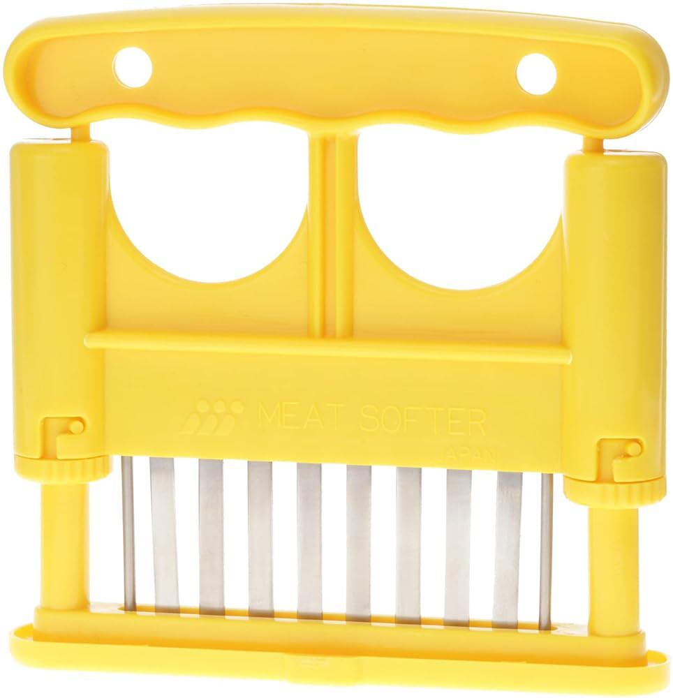 肉の筋切り器 ミートソフター イエロー 日本製 サイズ(約):外寸縦130×横130mm 生産国:日本 素材・材質:本体/ABS(アクリロニトリル・ブタジエン・スチレン)樹脂・刃部/SUS(ステンレス鋼)420 食材の筋切に