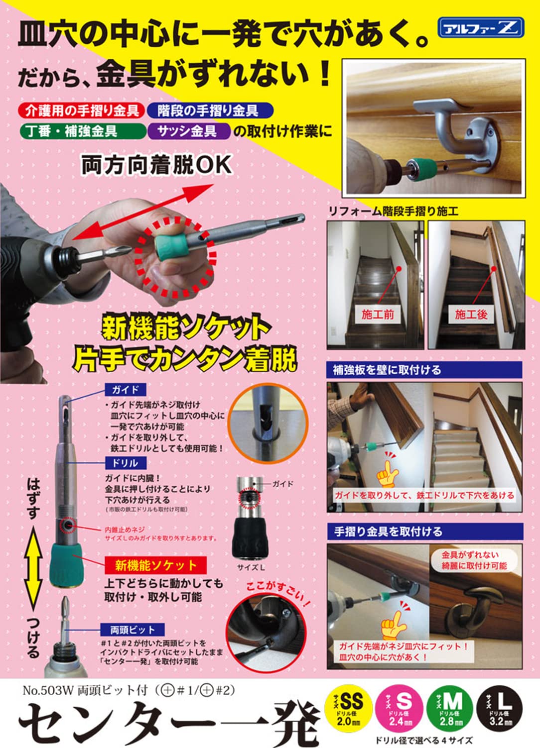 ・手摺金具・丁番・補強金具の取付け穴の中心に穴あけが可能