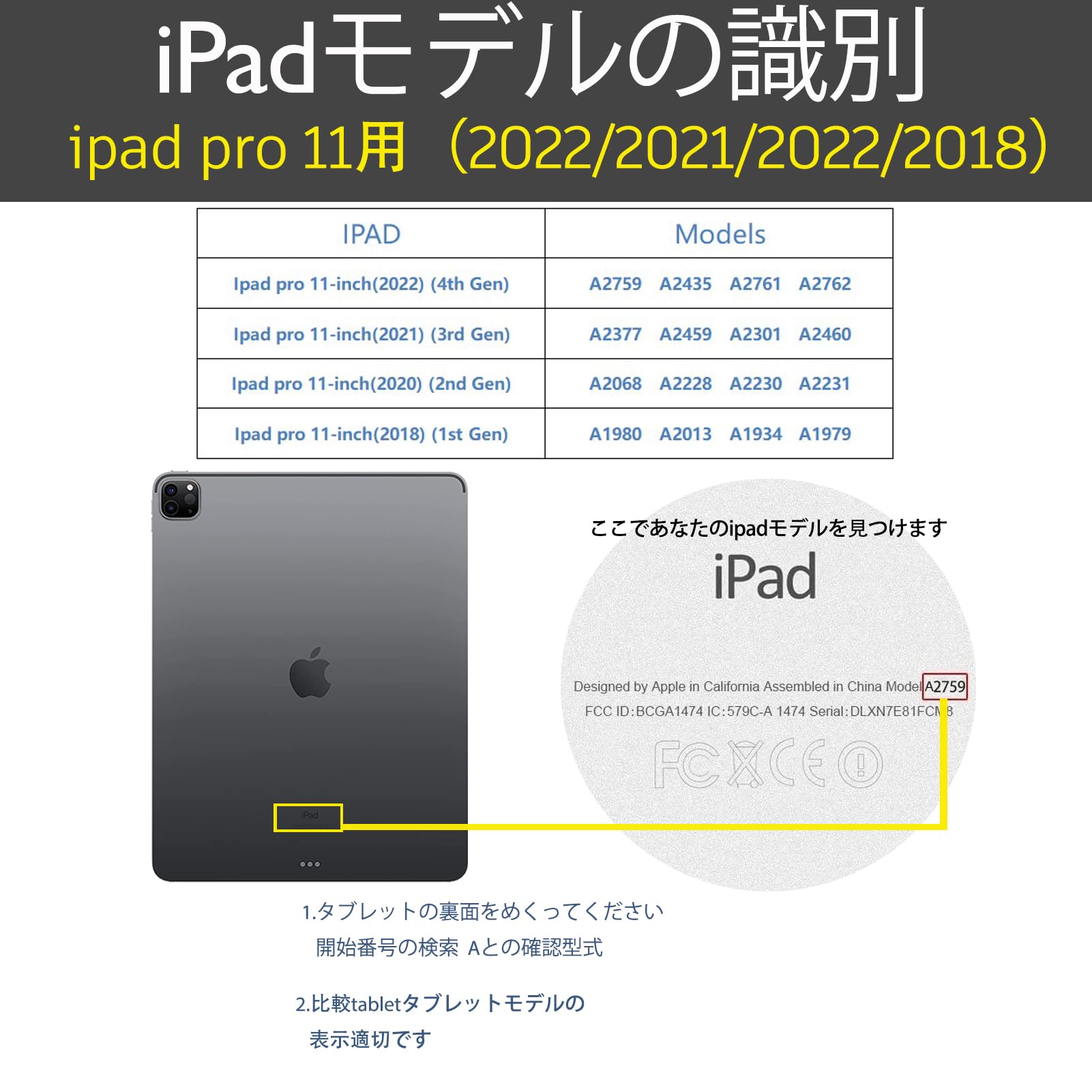 [対応機種] - アップルのiPad Pro 11「2022第4世代(モデル:A2435/A2761/A2762)、iPad Pro 11 2021(モデル:A2377、A2459、A2301、A2460)、iPad Pro 11 2020(モデル:A2068、A2228、A2230、A2231)、iPad Pro 11 2018(モデル:A1980、A2013、A1934、A1979)向けに設計されています。他のiPadモデルとは互換性がありません。