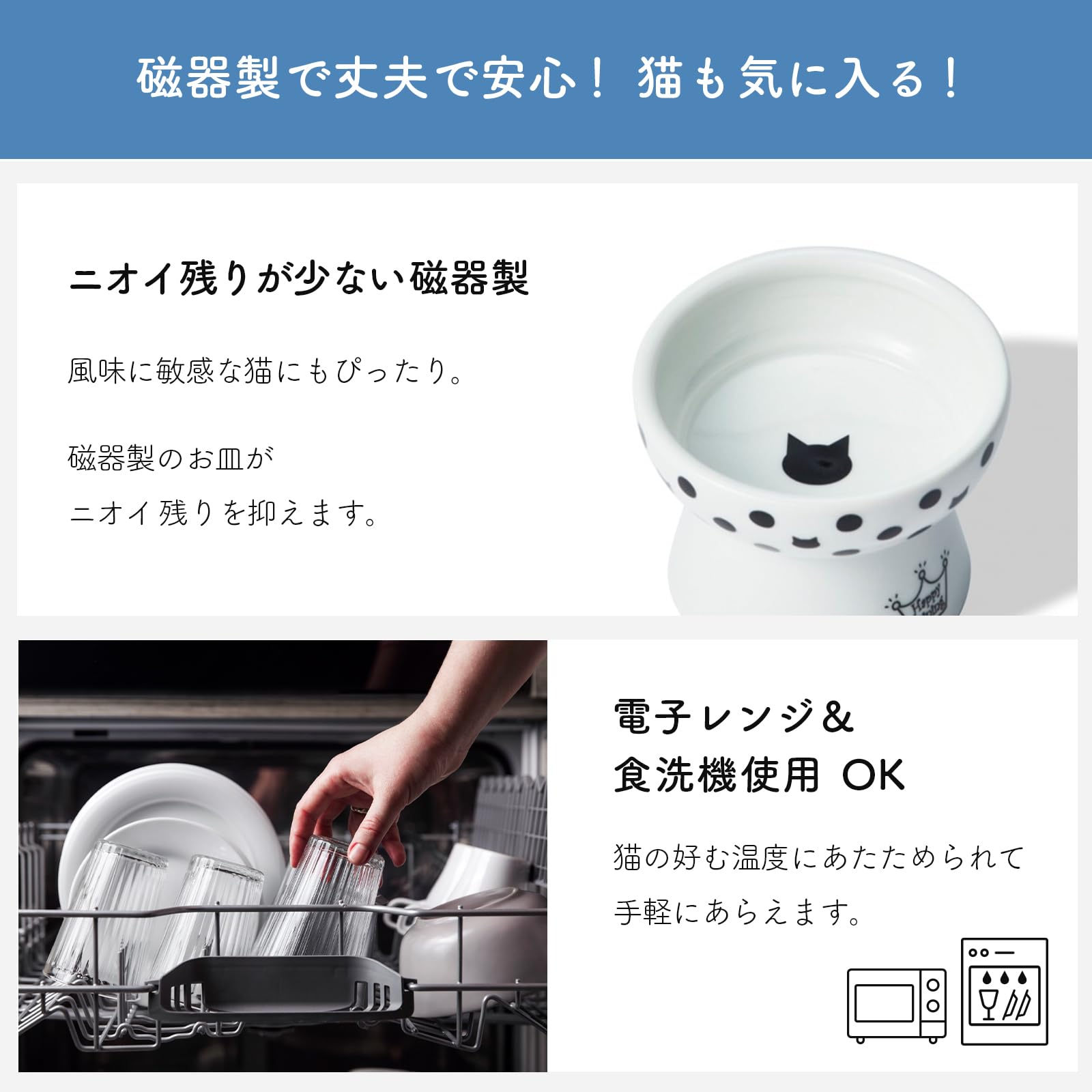 【電子レンジOK食洗機OKな磁器製食器】電子レンジ使用OKなので、手作りごはんやあたためたごはんをあげたい時でも、移し替える手間がいりません。また、磁器製なのであたたかいフードが冷めにくいという特徴もあります。食洗機での使用もOKなので、ウェットフードを食べた後など、手洗いでは汚れが落ちきらない時などに便利です。