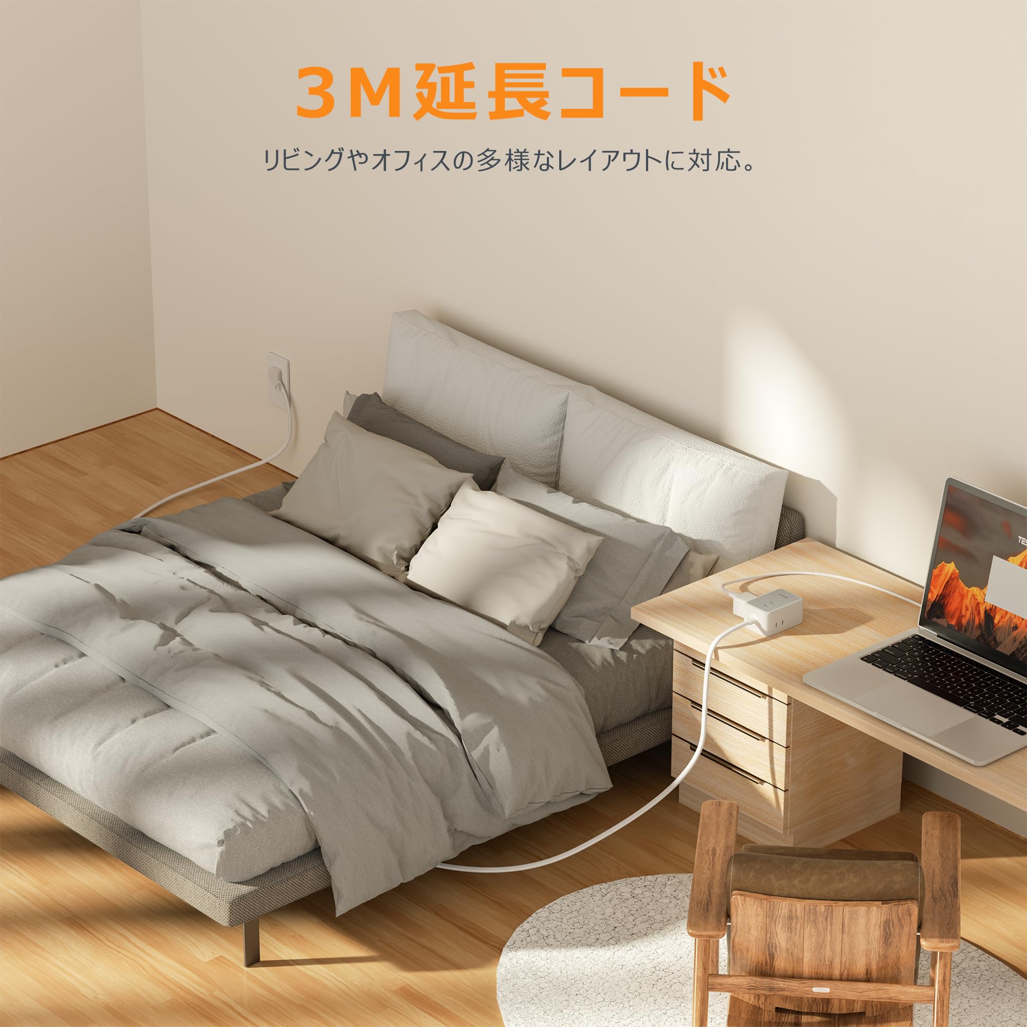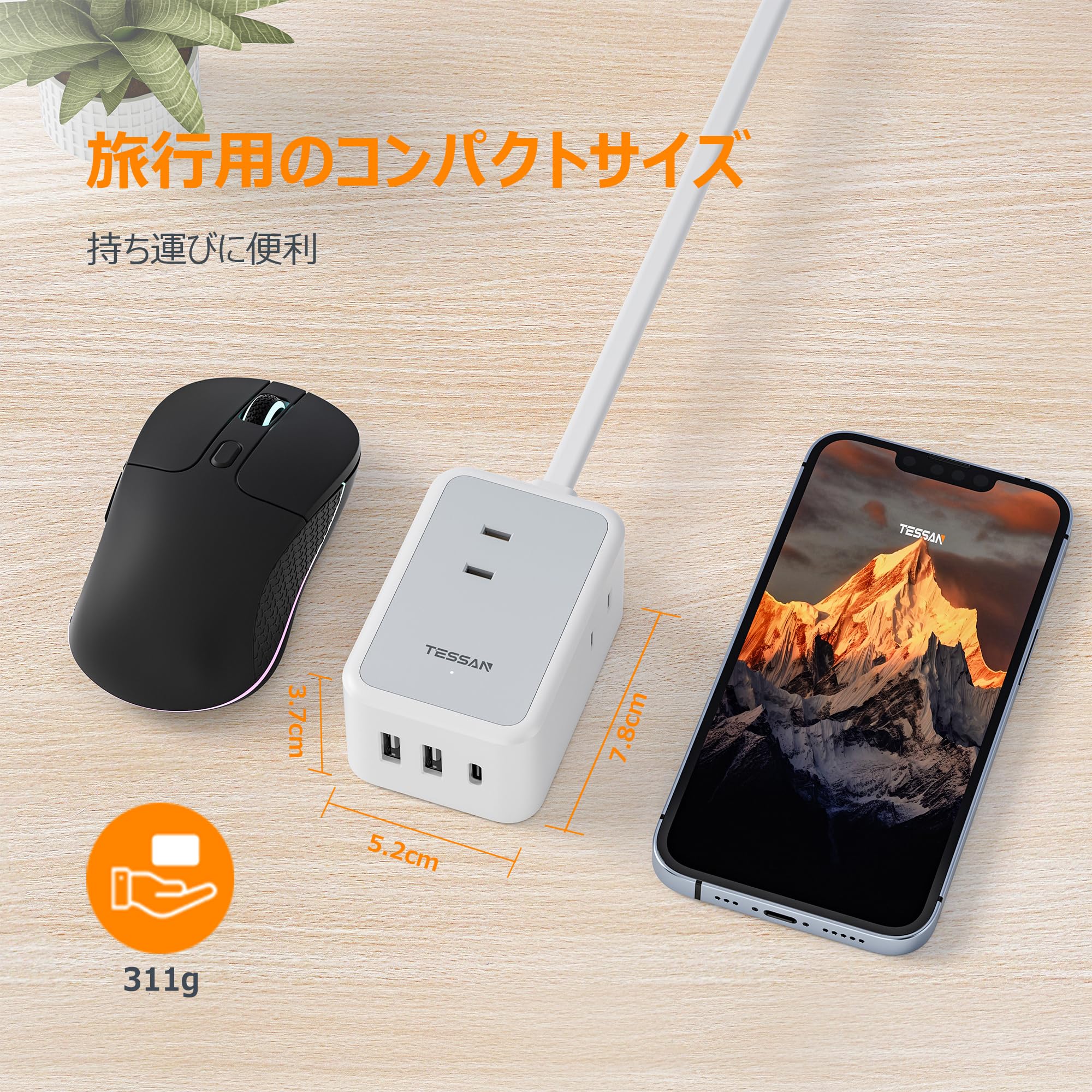 【使用者の便利に配慮】サイズはわずか7.8x5.2x3.7cm(重量311g)、3mの長いコードで、ソファ周りやオフィスでのマルチデバイス充電に便利です。