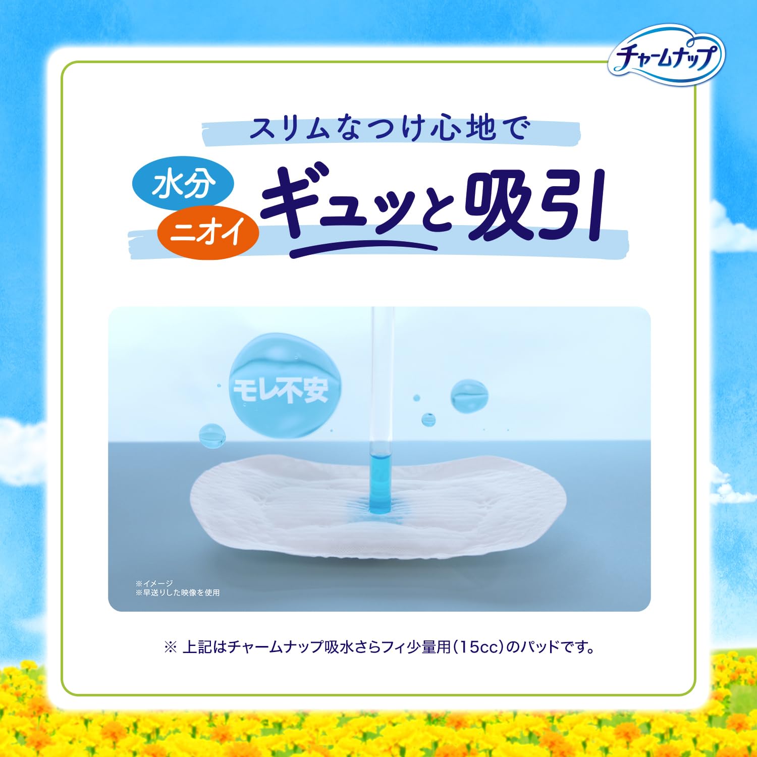 夜用ナプキンサイズで水分・ニオイまでギュッと吸引。尿もれパッド、吸水ナプキン タイプです。