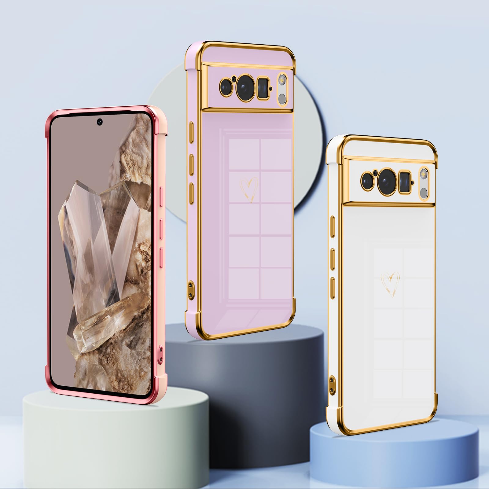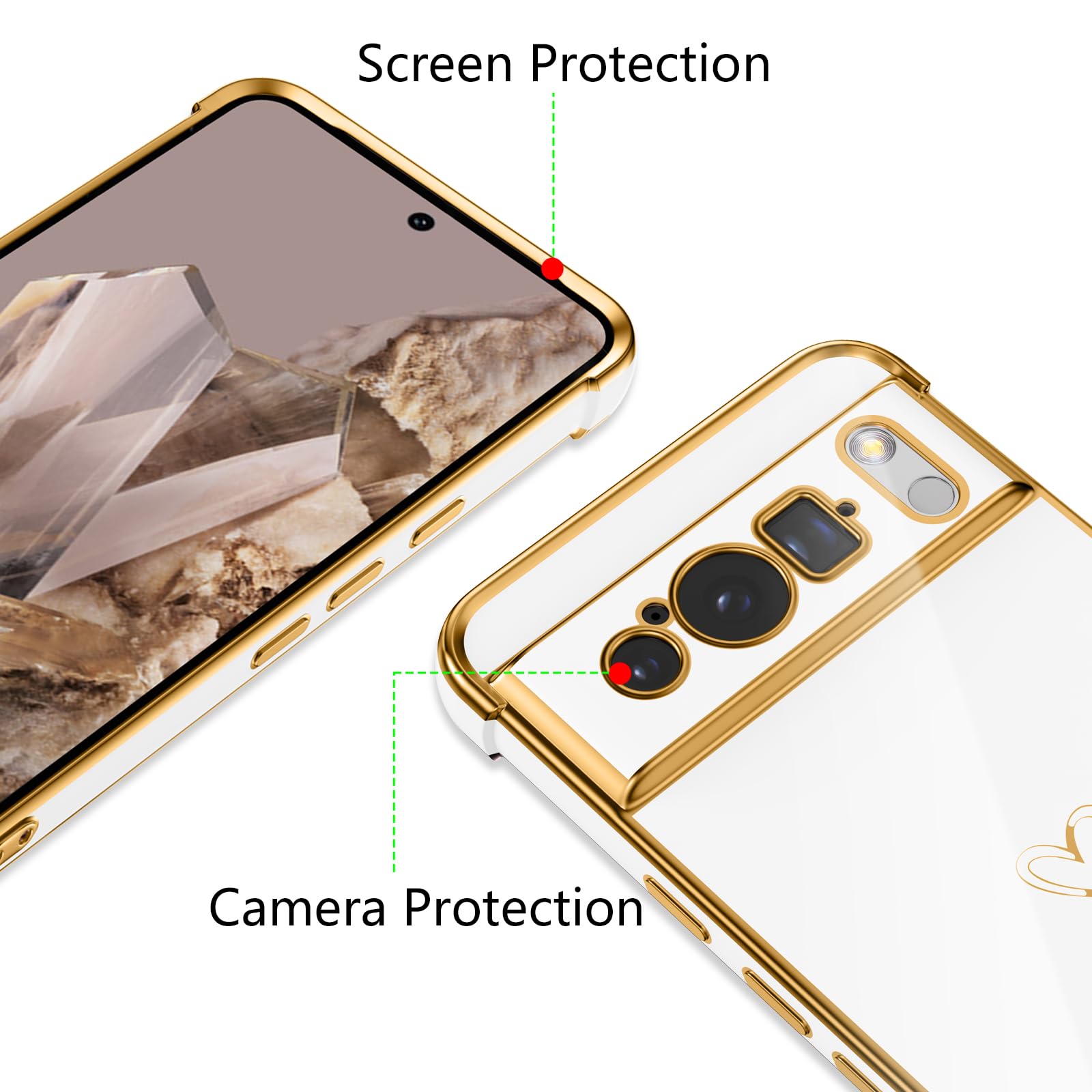 ZTOFERA Google Pixel 8 Pro 用 ハートケース おしゃれ 韓国 かわいい グーグル ピクセル 8 Pro ケース 柔軟な TPU シリコン メッキ加工 ソフト 軽量 耐衝撃 携帯カバー 女性 心パターン Pixel 8 Pro スマホケース ワイヤレス充電対応 (ホワイト)