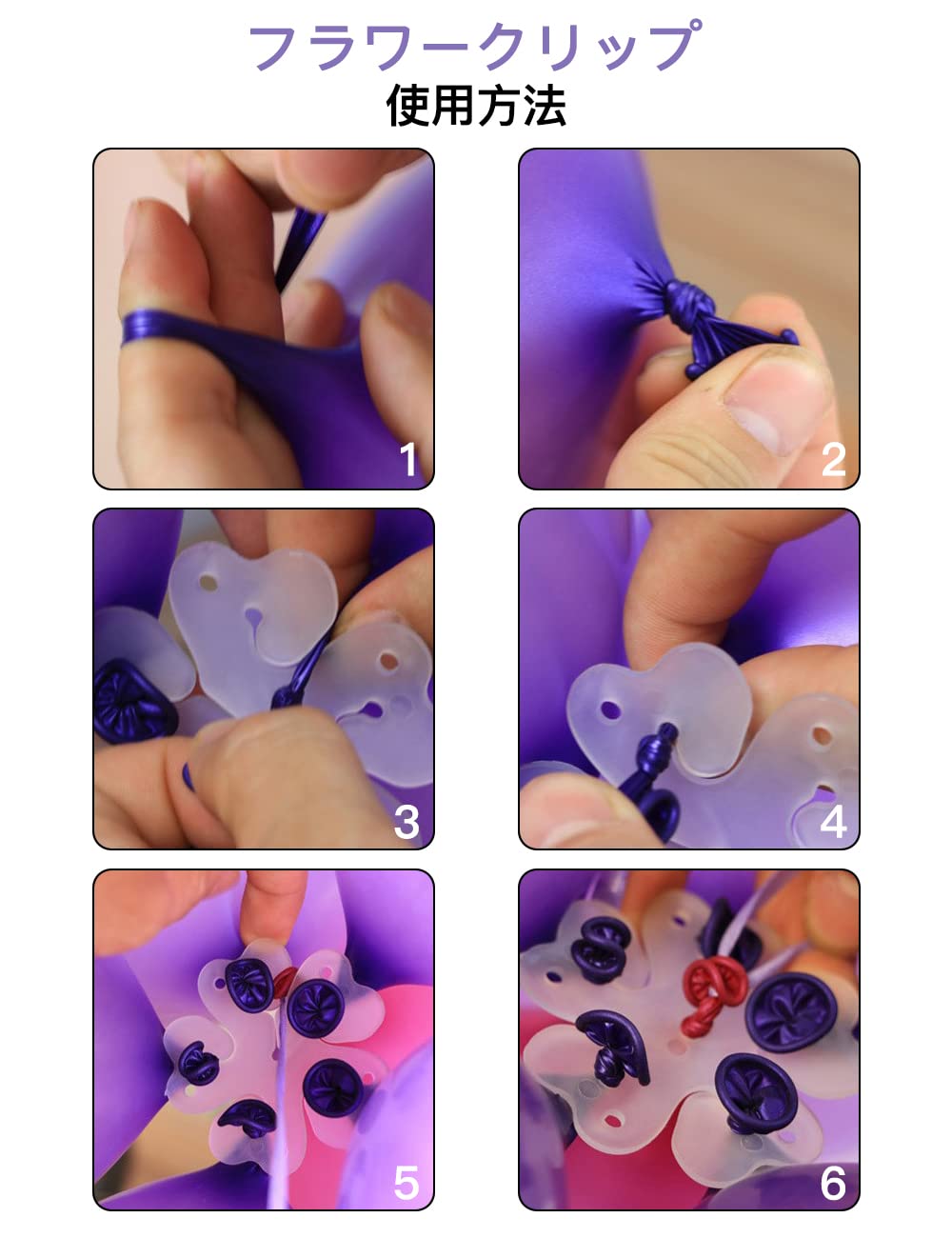 フラワークリップ:6つのバルーンで一つの花形のバルーンを作ることができます。プラスチック製で再利用可能です。