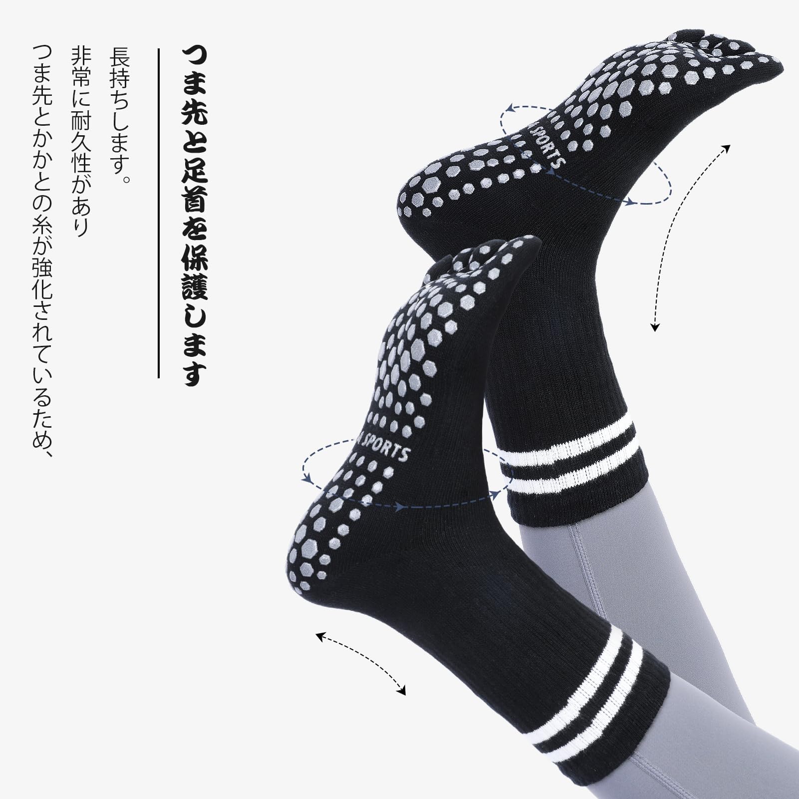 【5本指】普通のソックスに違い、これらのは5本指デザインで、5本の指先が自由に動かせるので細かい動きでも床とフィットして思い通りの動きができます