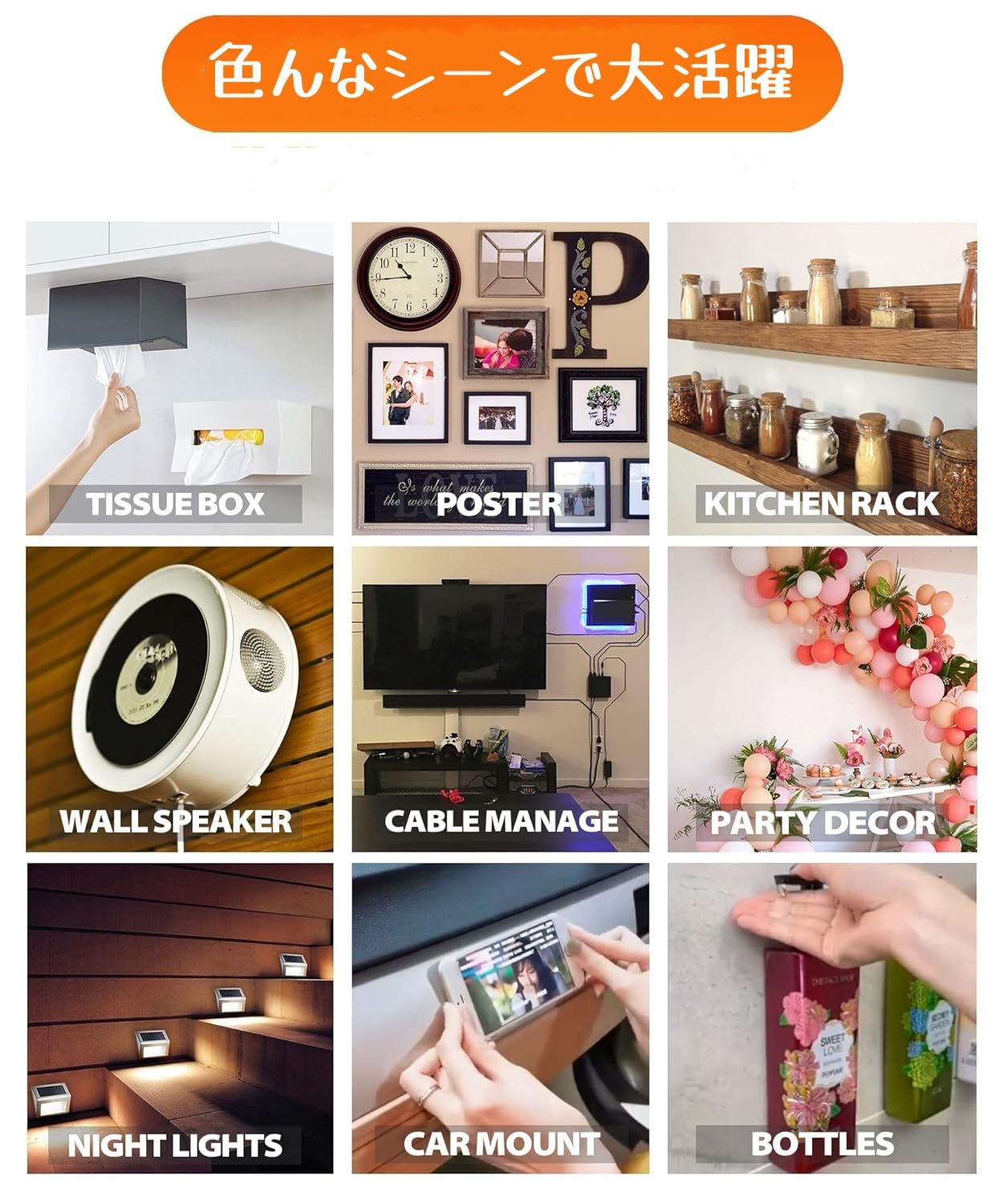 【幅広い用途と高い実用性】キッチン用品の壁面収納・ティッシュ等の生活用品の空間収納・扉裏収納・リモコンの空間収納・玄関マットのズレ防止・額縁や写真パネルの固定・イベント装飾・小物家具の固定・観葉植物・花瓶の固定・車内で小物の固定・ドラレコ・ETCアンテナ固定等.