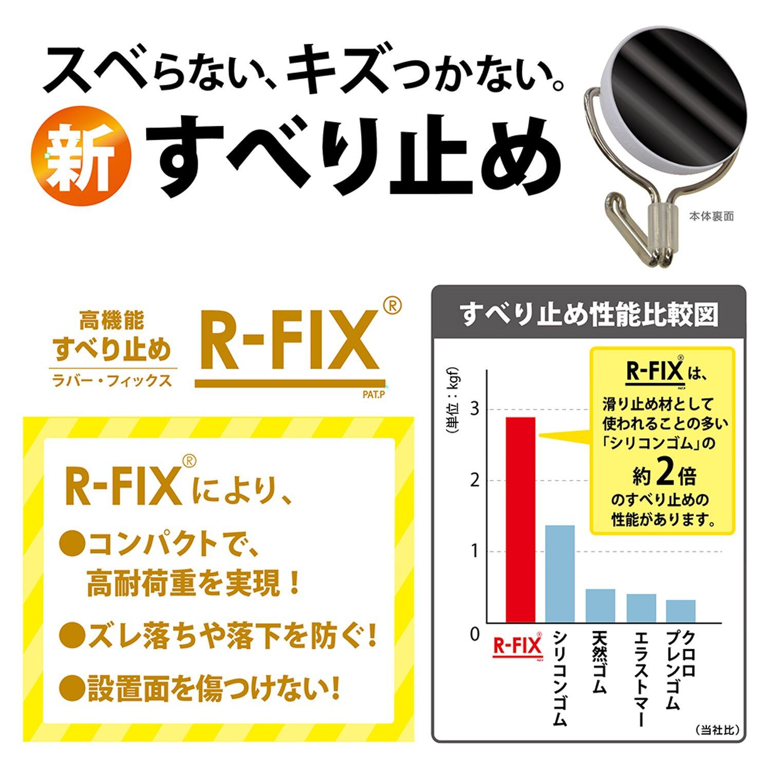 ズレ落ちにくいすべりどめシート「R-FIX」が本体のコンパクト化と高耐荷重を実現。