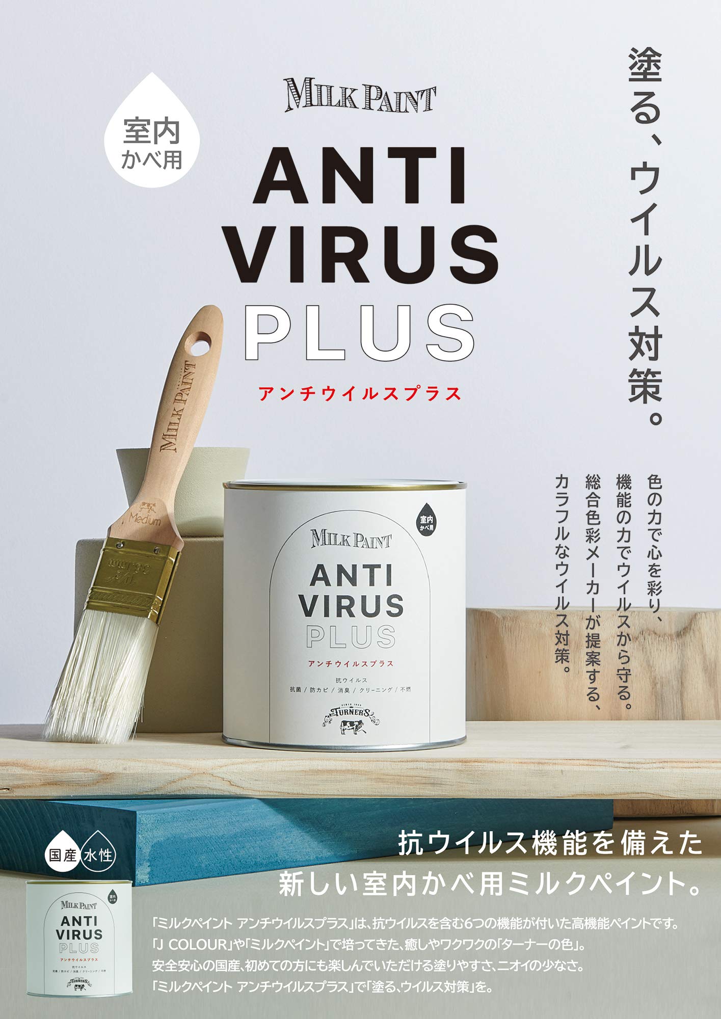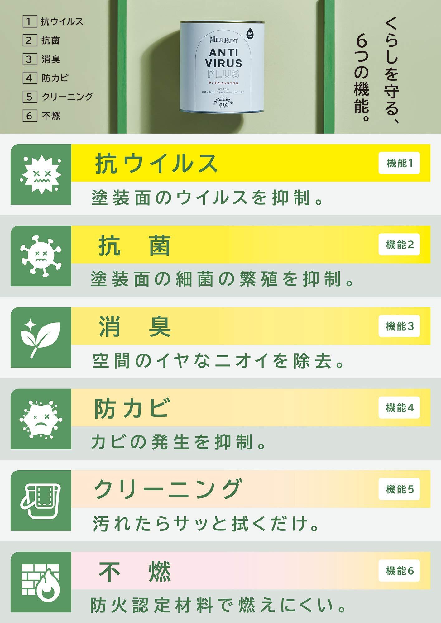「ミルクペイント アンチウイルスプラス」は、抗ウイルスを含む6つの機能が付いた高機能ペイントです。