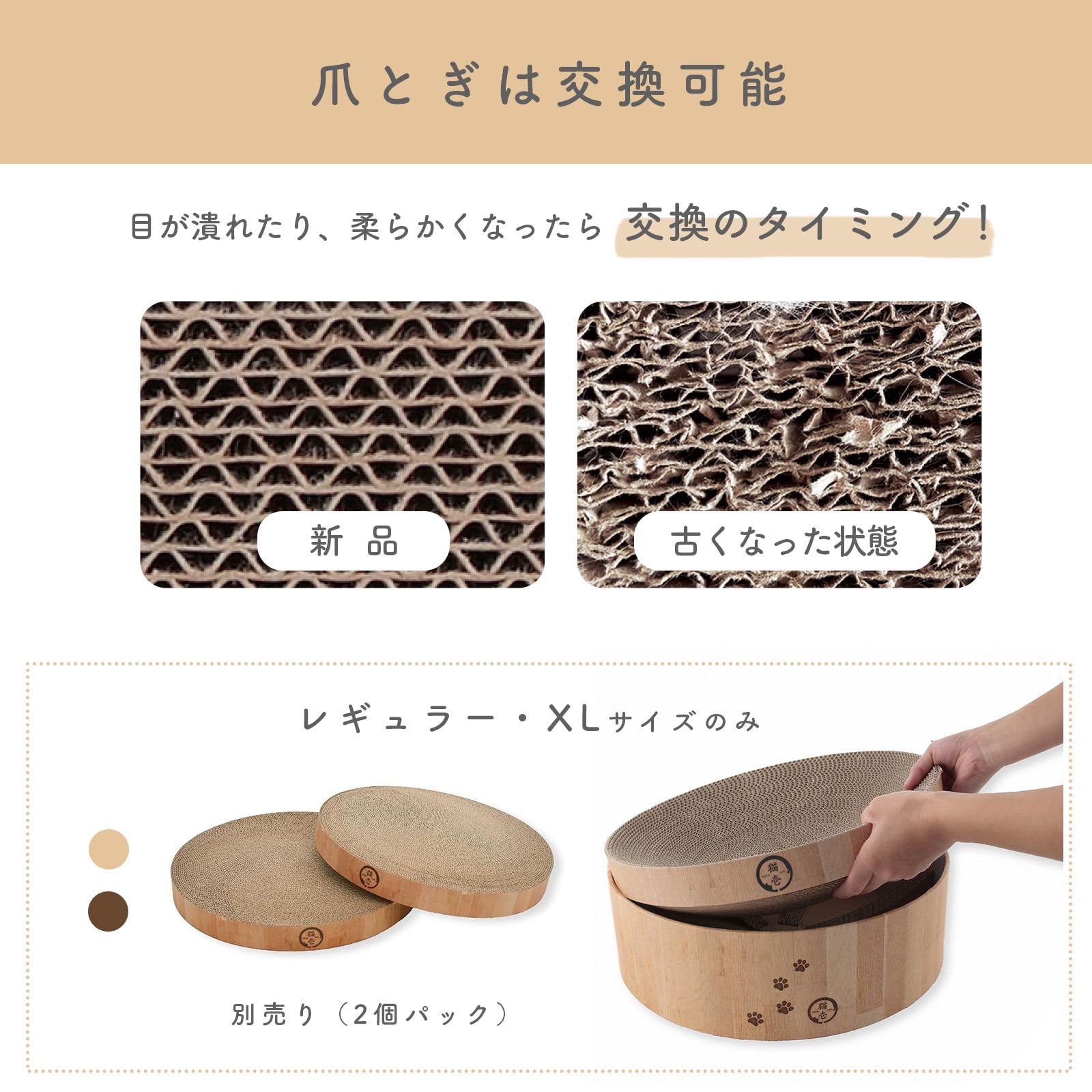 【XLサイズもつめとぎ部分は交換可能】バリバリボウルの特徴であるつめとぎ部分のみの交換、XLでも可能です。 交換用つめとぎとして販売しています(別売り)。 猫のつめとぎは消耗品だからこそ、長く使っていいただけるよう、工夫しています。