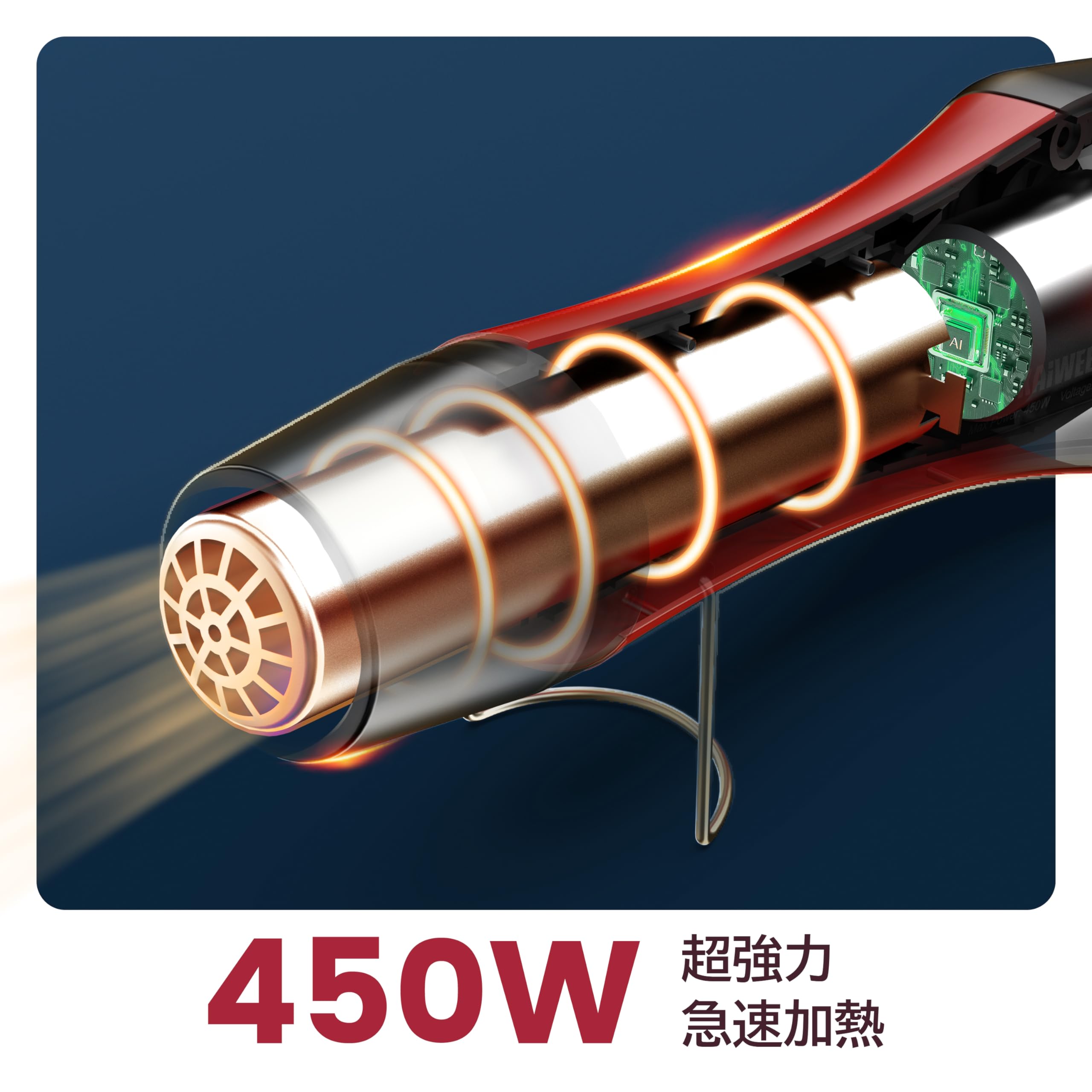 【急速加温】通常の小型ヒートガンより強力な450Wパワーがあり、スイッチを入れるだけで数秒以内に最大450℃の高温になるので時間が節約され、本格的な熱風加工作業率も大幅にアップします。さらに250℃と450℃の温度切り替えと風量を300L/min、500L/minで2段階調節機能は用途や素材に合った温度に切り替えて作業が行えます。例えば塗料やパテの乾燥、包装用のシュリンクフィルム収縮に適した250℃と、ブラスチックの曲げに便利な450℃。