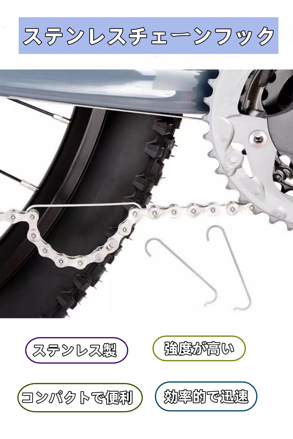 【セット内容】チェーン修復工具5点キットです。チェーンカッター×1、イジェクターピン×2、チェーンフック×2。【適用】自転車チェーンカッターは6速から12速、シングルスピードチェーンを含む様々な自転車チェーンに対応。チェーンピンの取り外し・取り付けが簡単に行えます。
