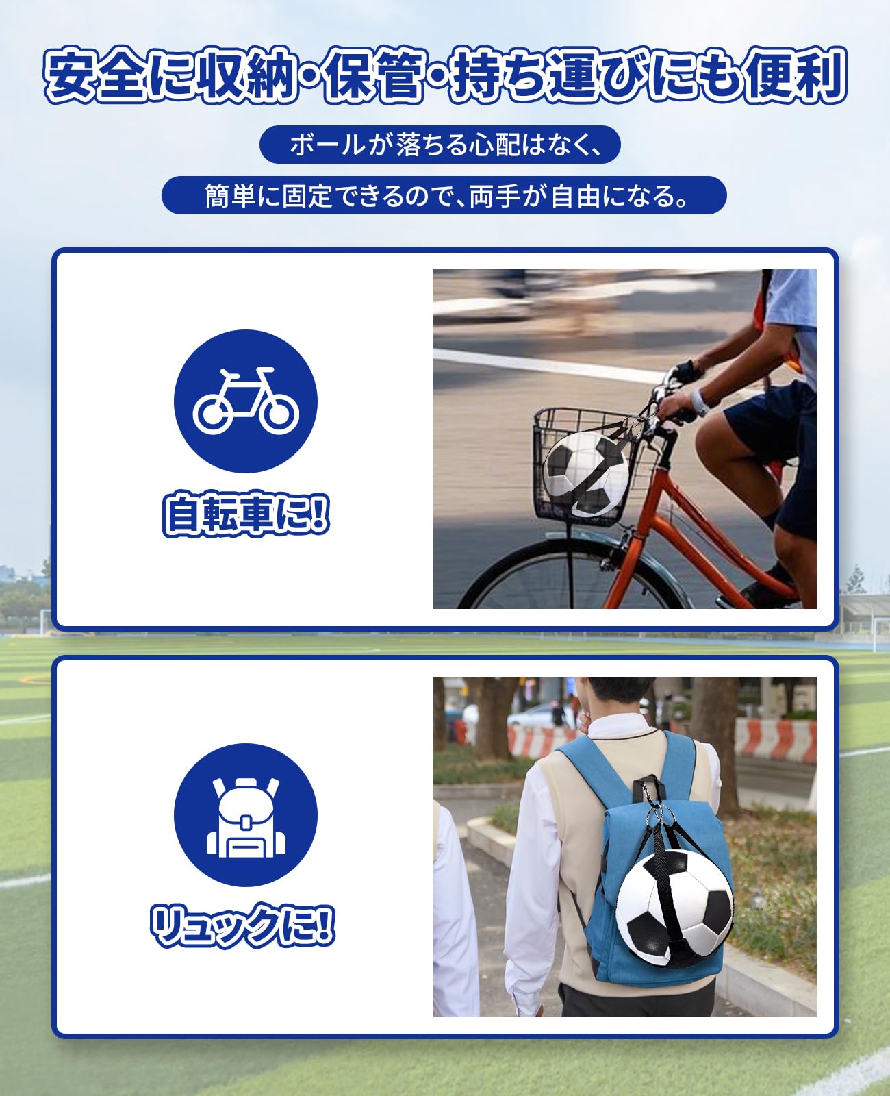 【便利で安全】ボールホルダーのボールネットとカラビナを組み合わせると、ボールの落ちる心配をすることなく、リュックや自転車にボールを簡単に取り付けることができ、両手が自由になる。さらに、ボールホルダーのバンドには滑り止めのシリコンが使用されており、持ち運び時にボールが滑り落ちるのを防ぎ、安全性と便利性を向上させている。